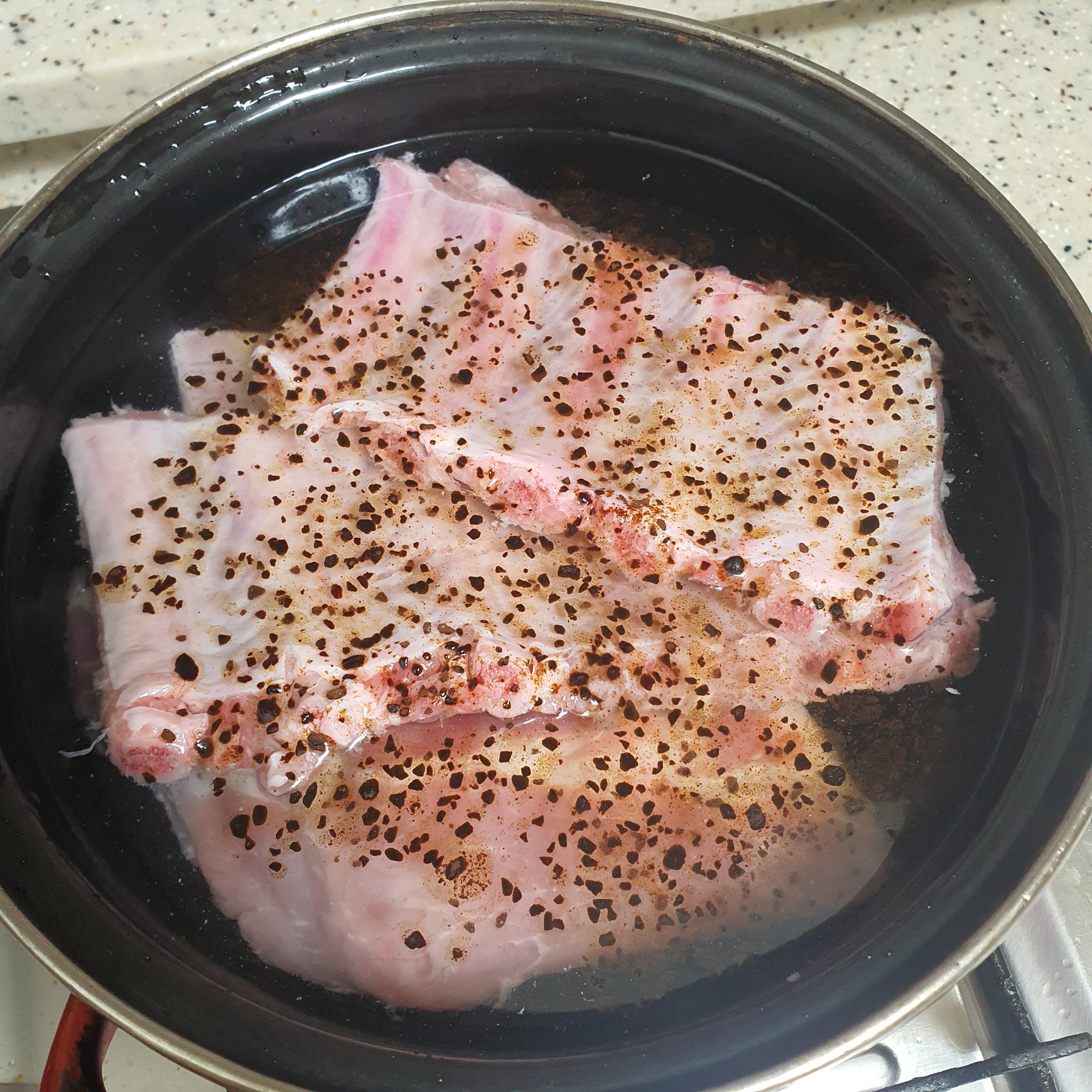 냄비에 핏물이 빠진 등갈비를 넣고 맛술, 커피 알갱이를 넣어 약 5분 정도 삶아 주었습니다.