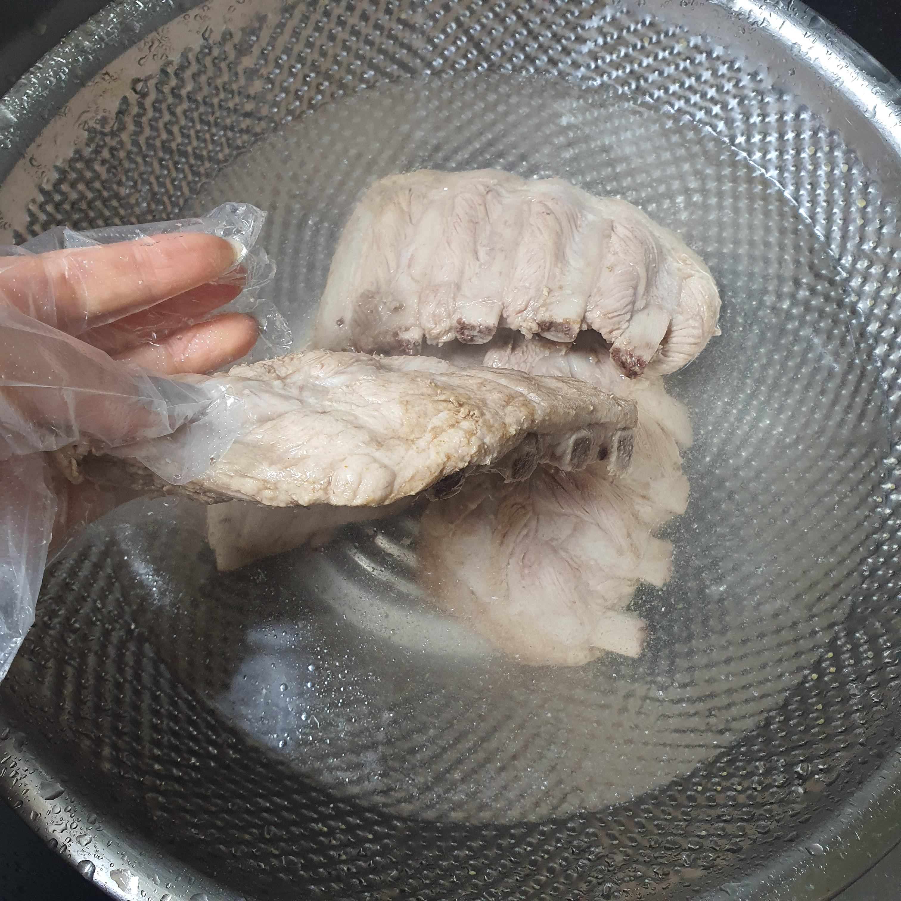 가볍게 삶은 등갈비를 물에서 세척해 줍니다.