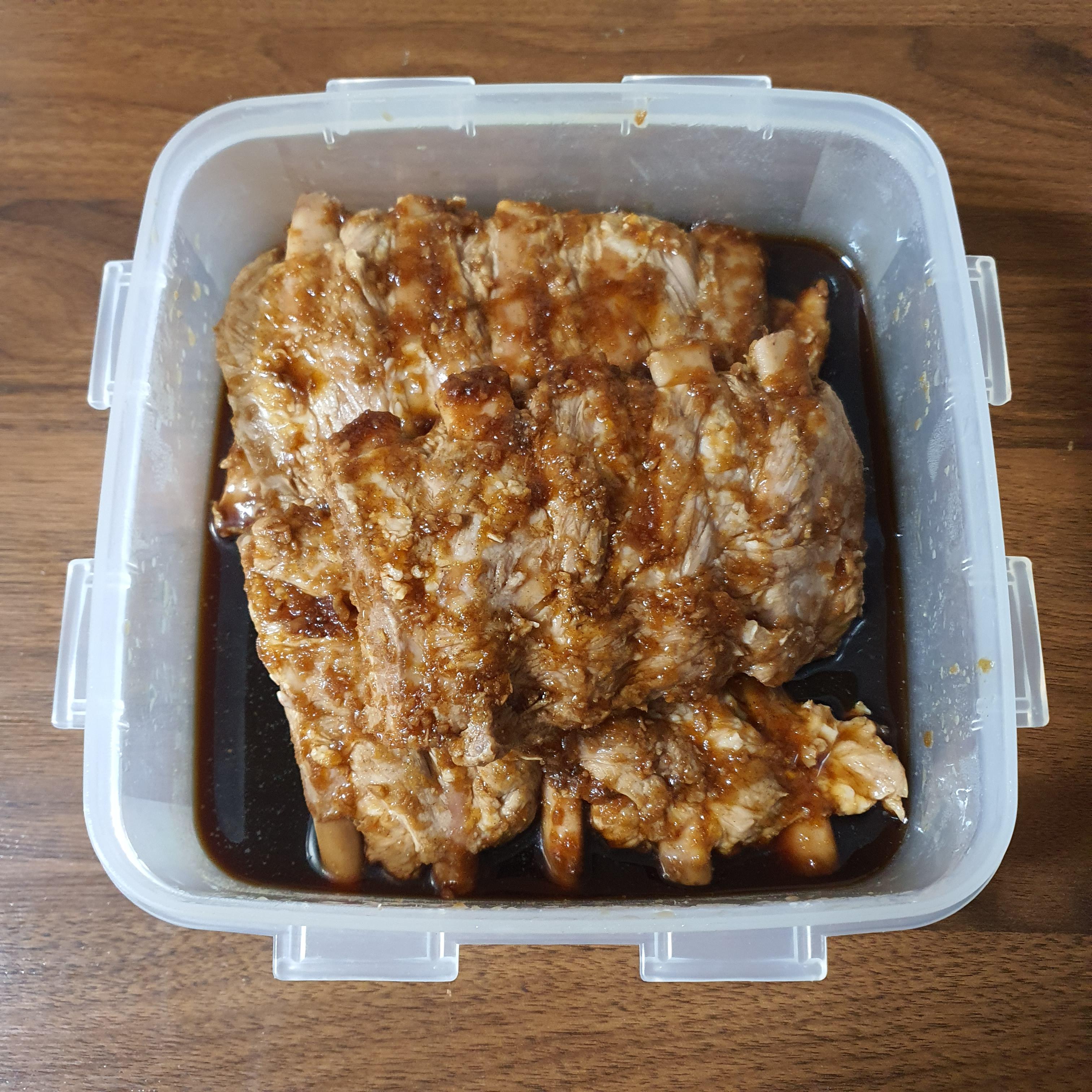등갈비를 통에 넣고 양념을 사이사이에 넣어주었습니다.