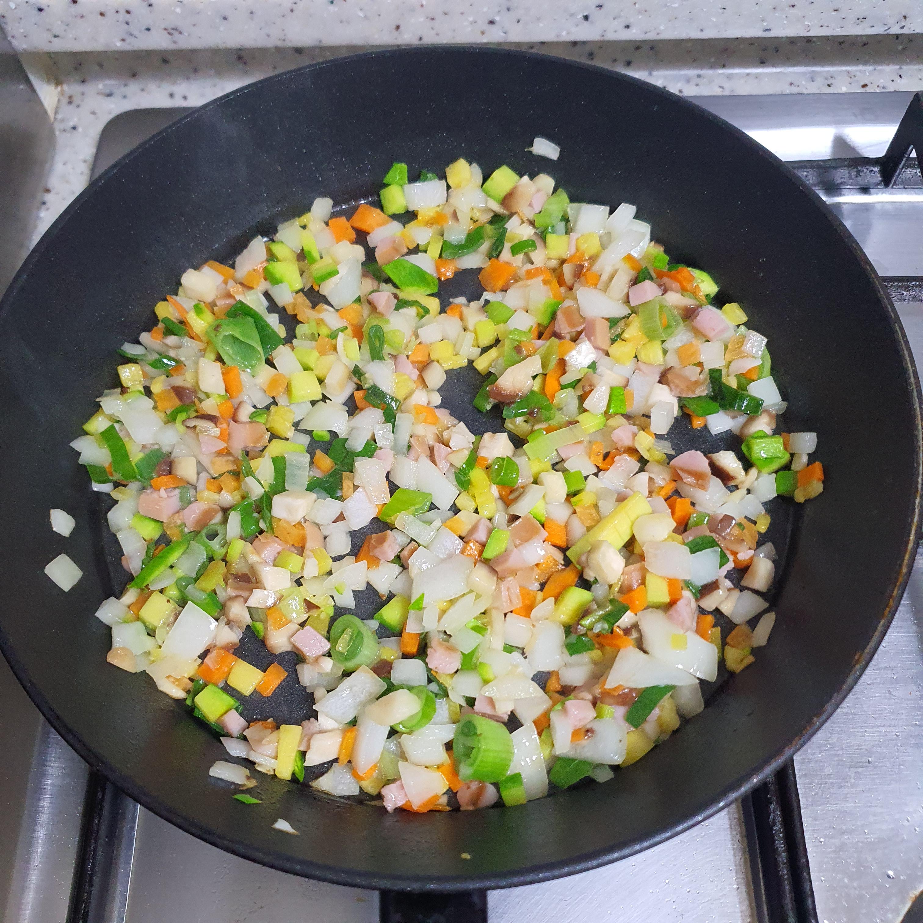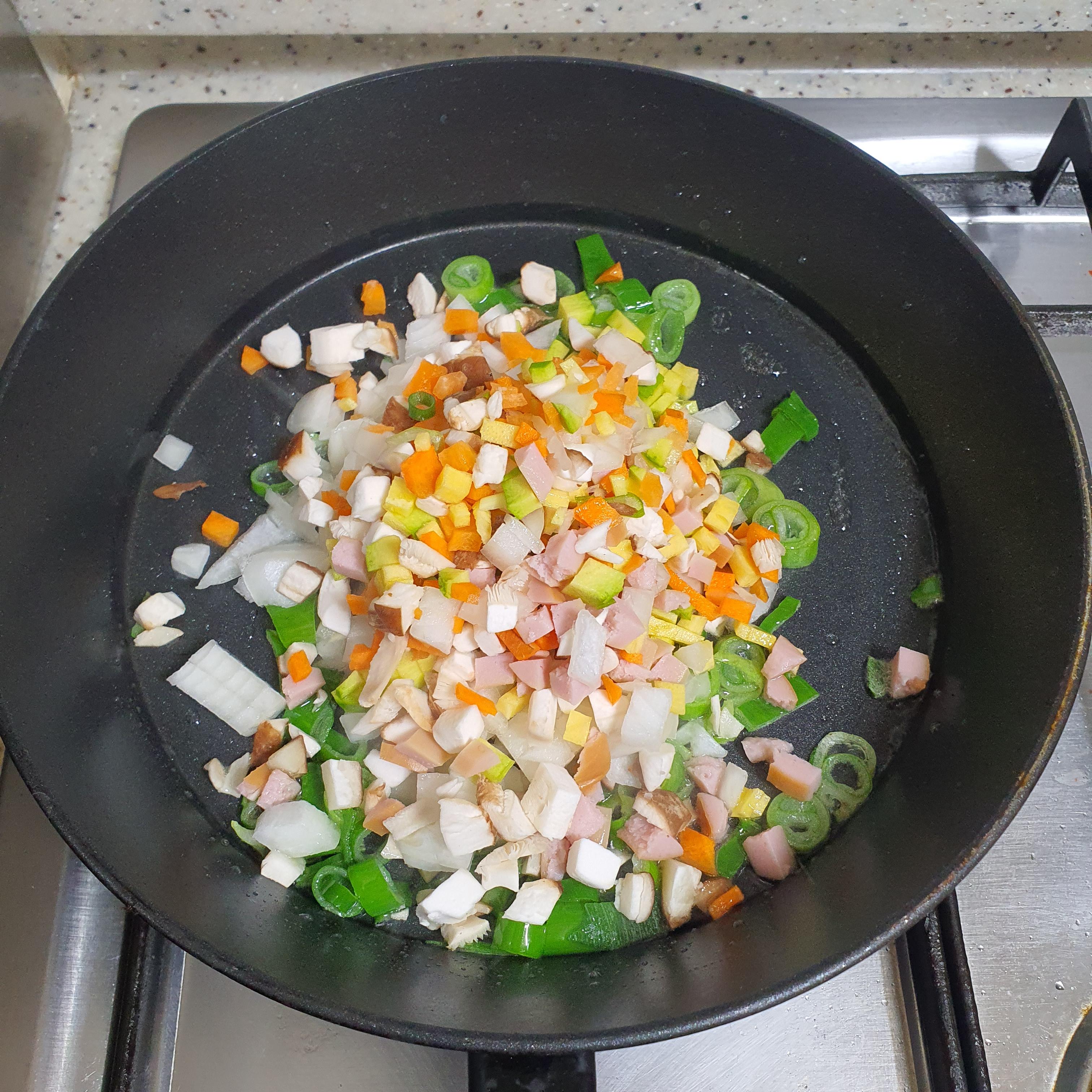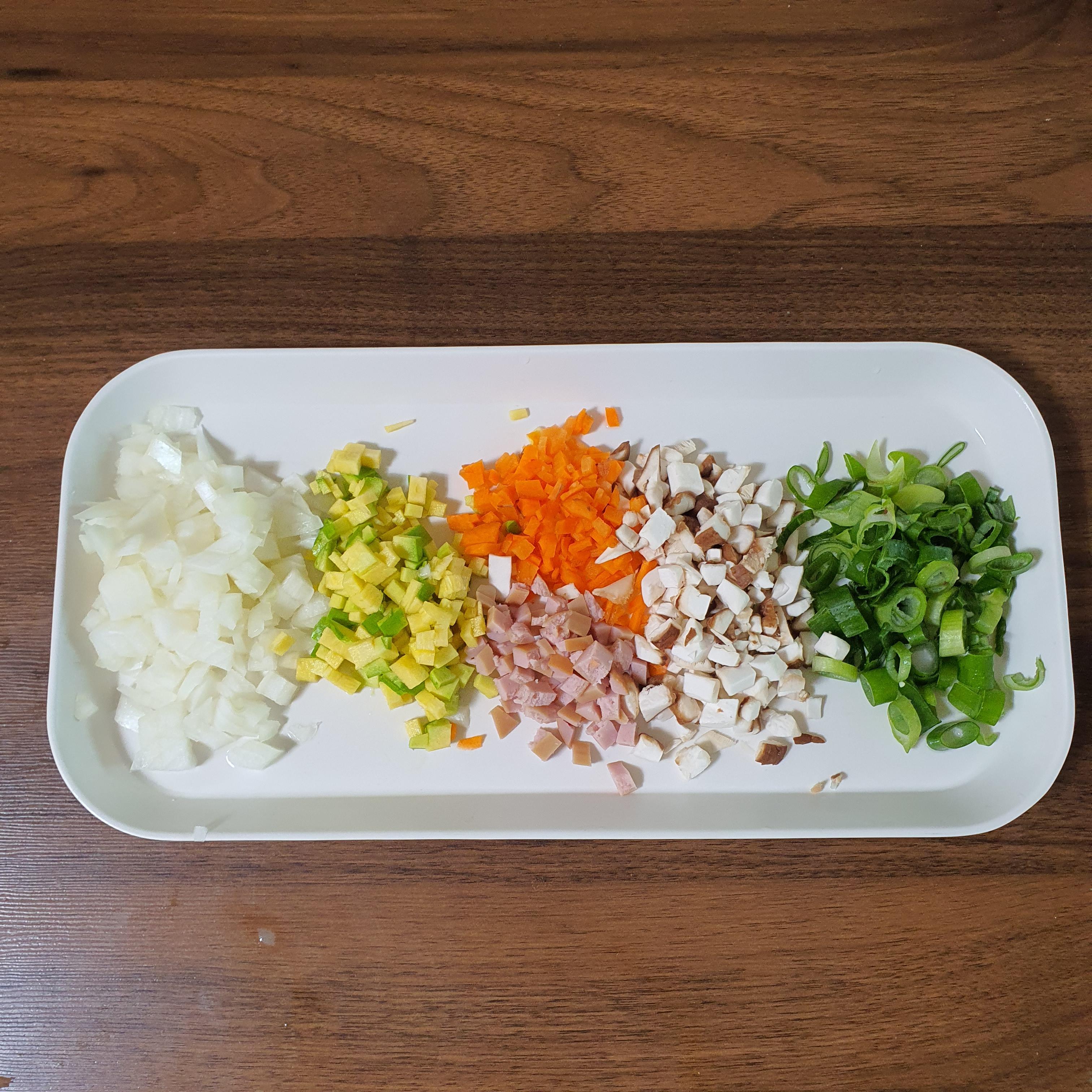 양파, 당근, 햄, 파, 표고버섯, 애호박, 계란, 깨