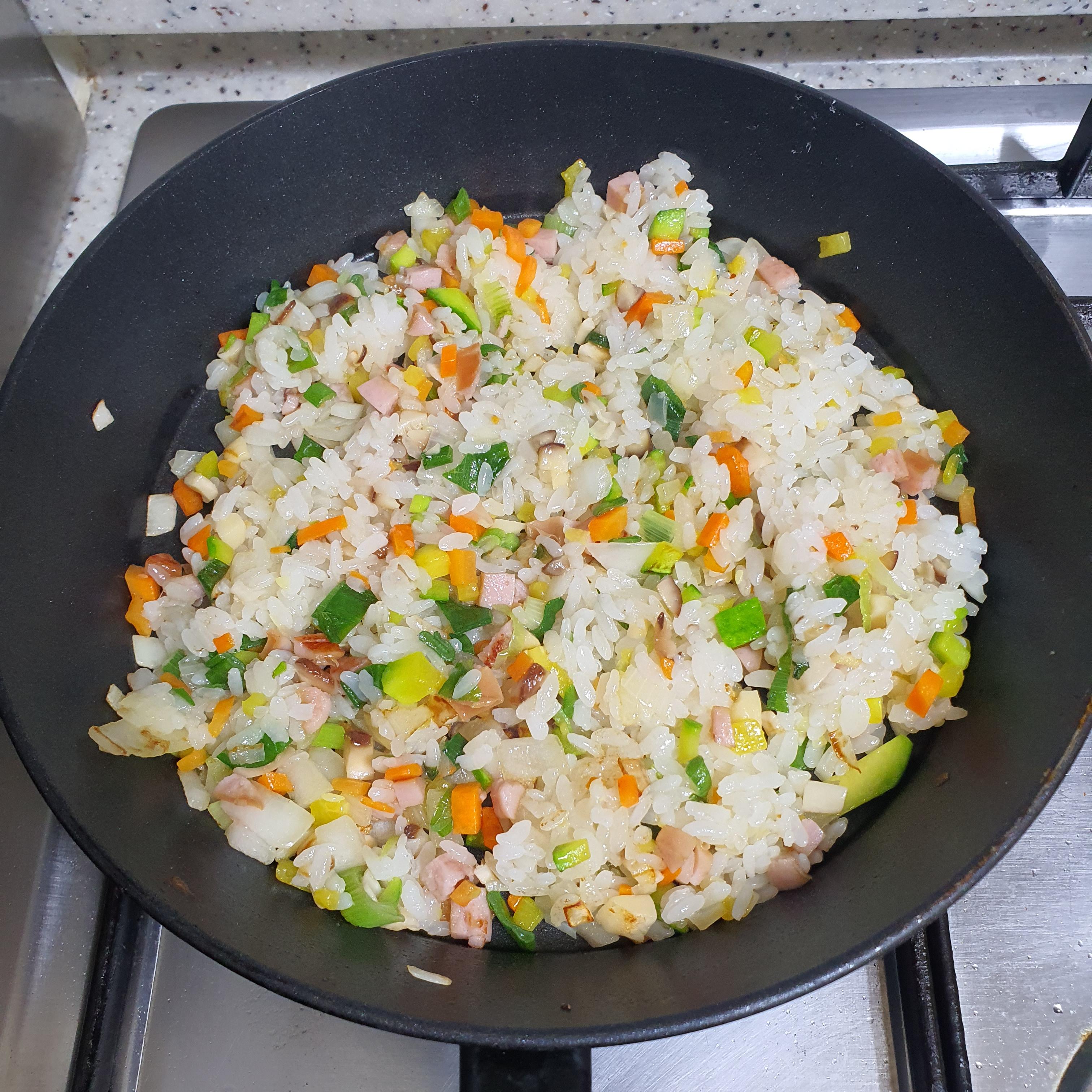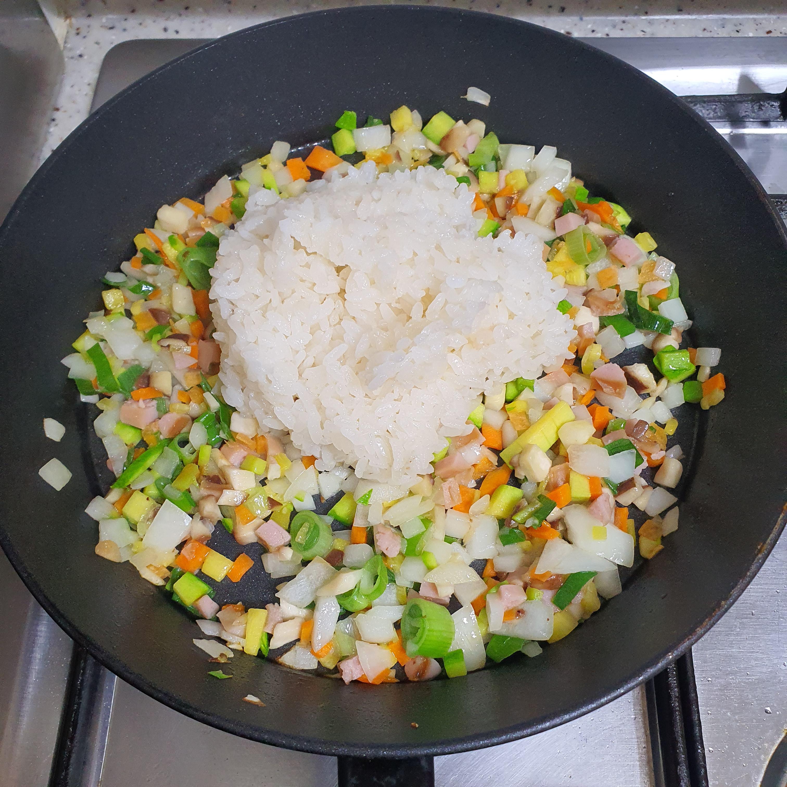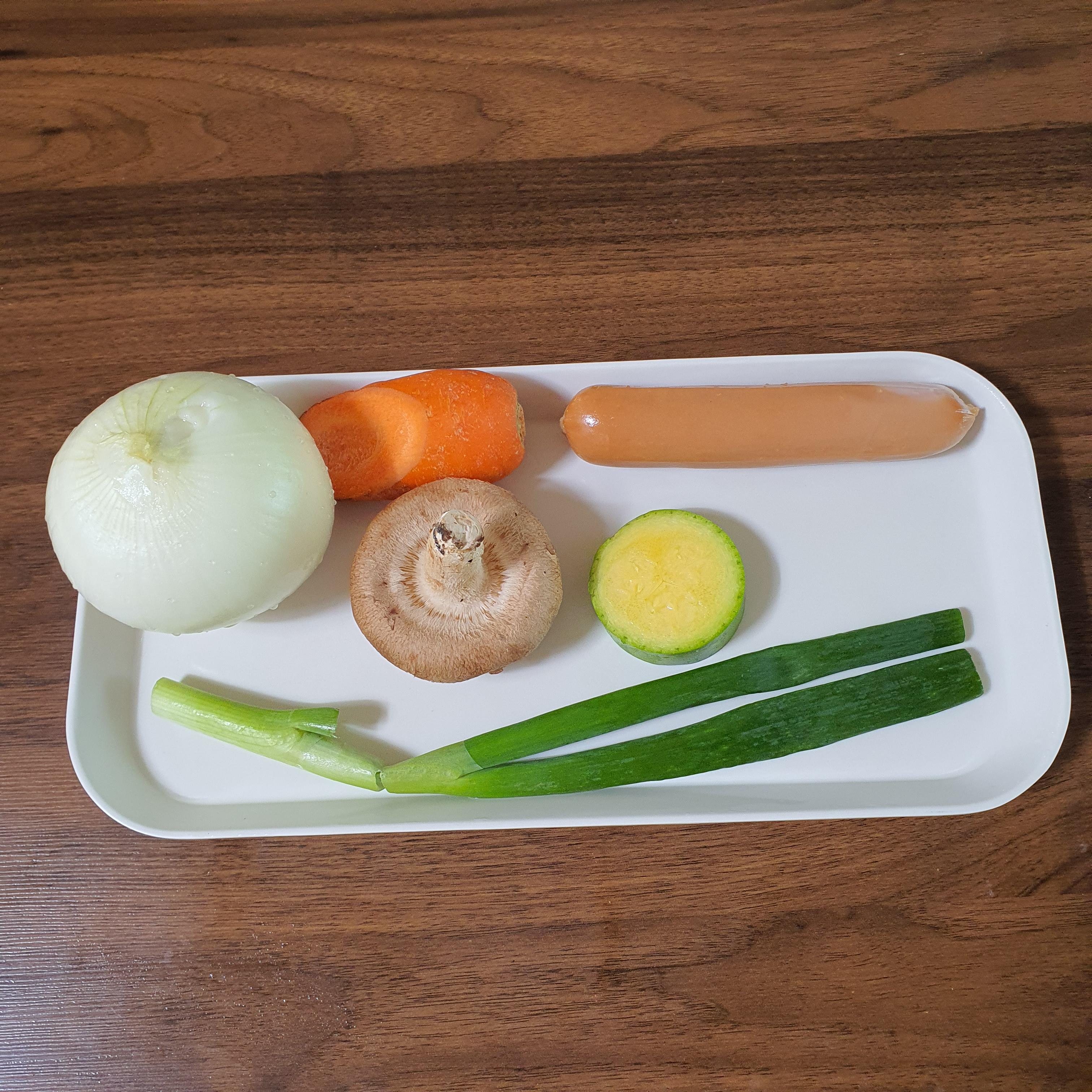 양파, 당근, 햄, 파, 표고버섯, 애호박, 계란, 깨