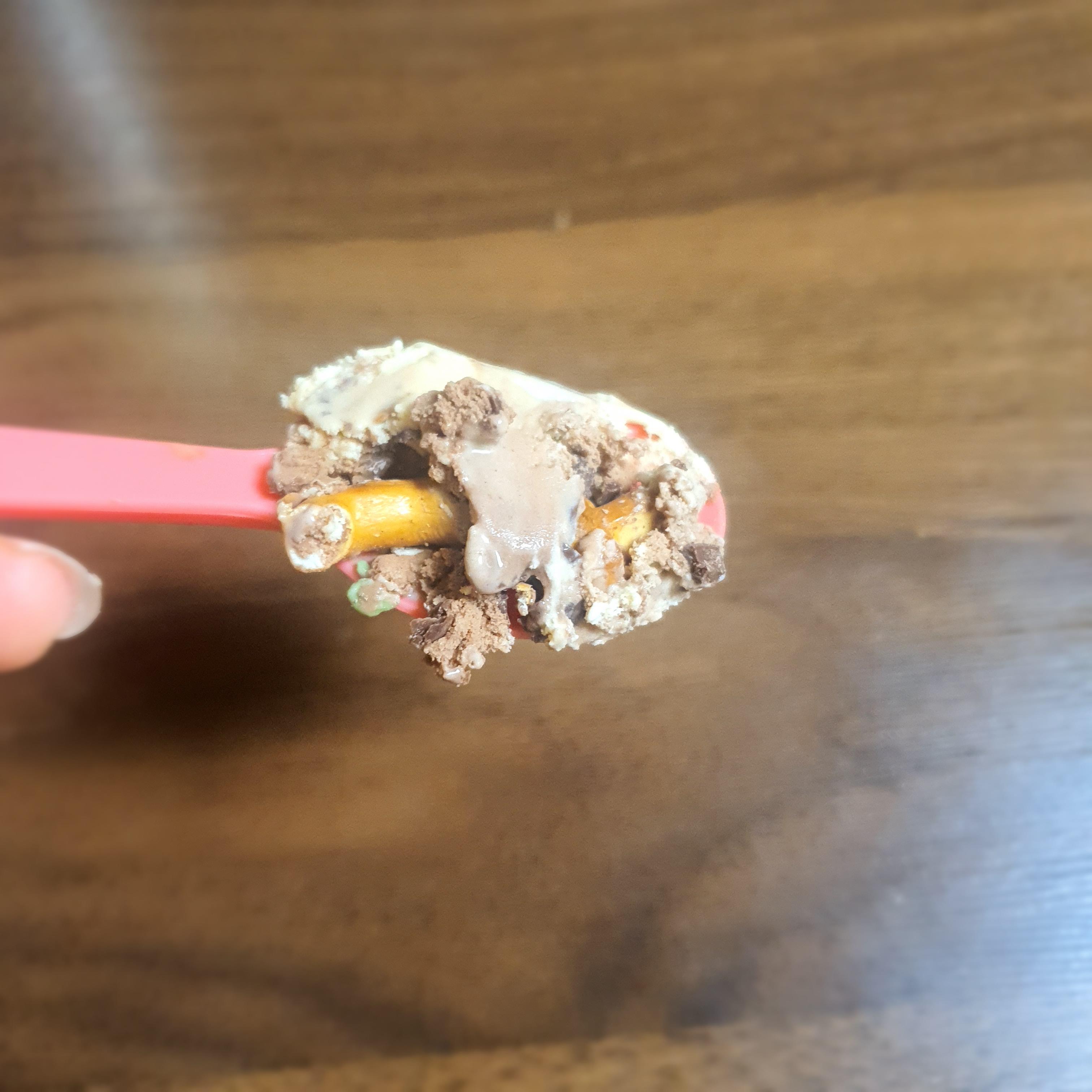 딱딱한 초콜릿도 중간 중간에 박혀 있고 프레첼 과자도 크게 박혀 있습니다.