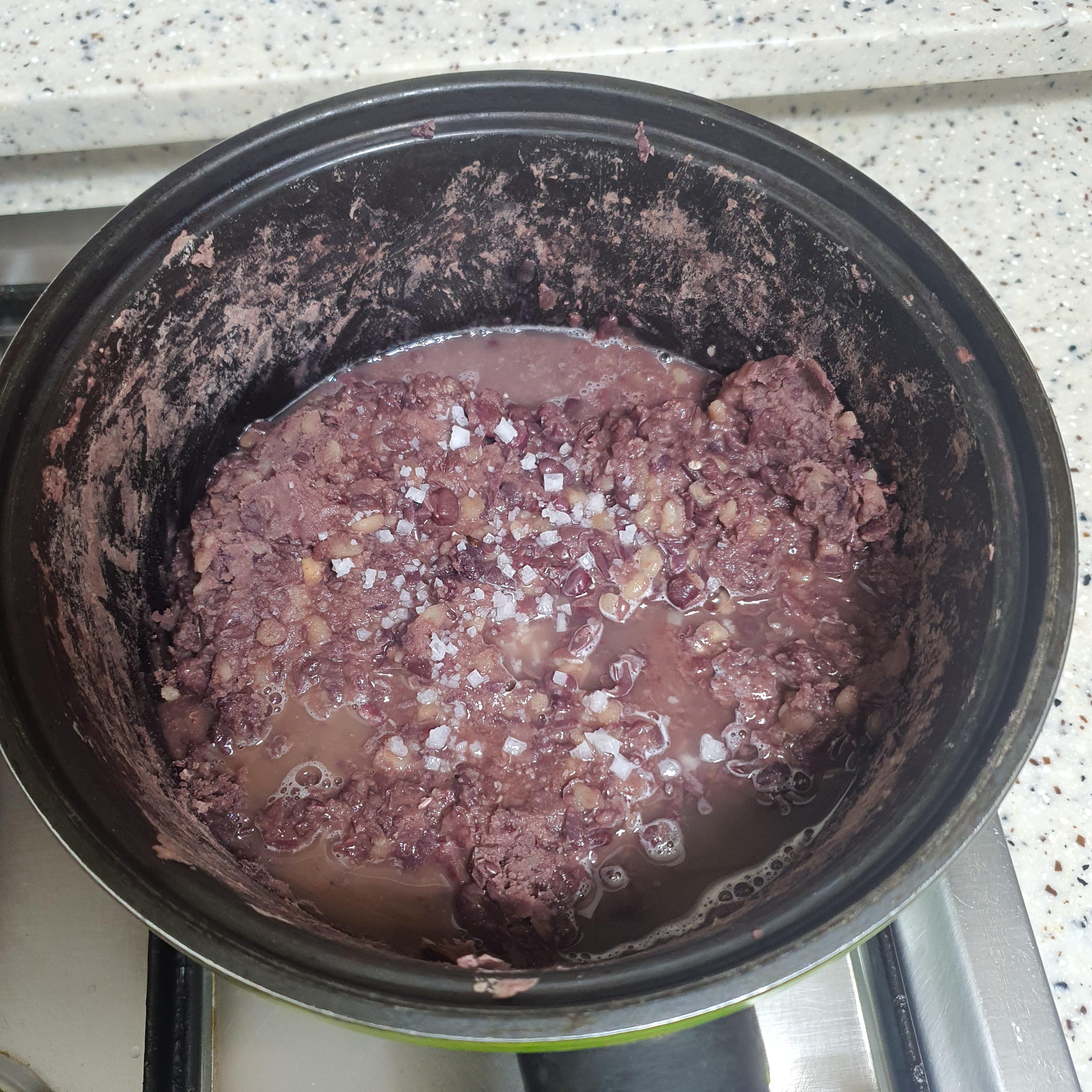 아까 덜어뒀던 팥물을 넣어주고 소금도 조금 넣어줍니다.