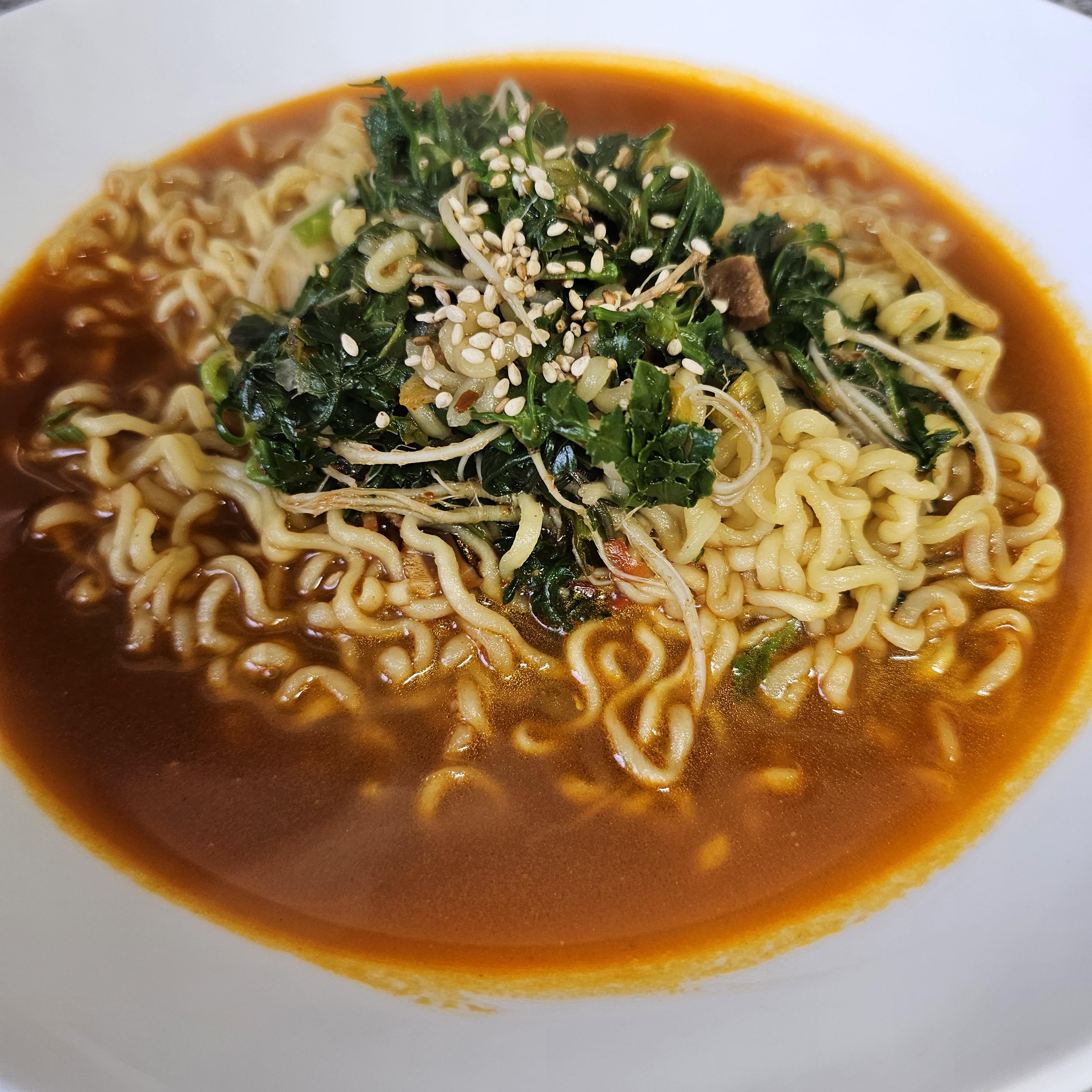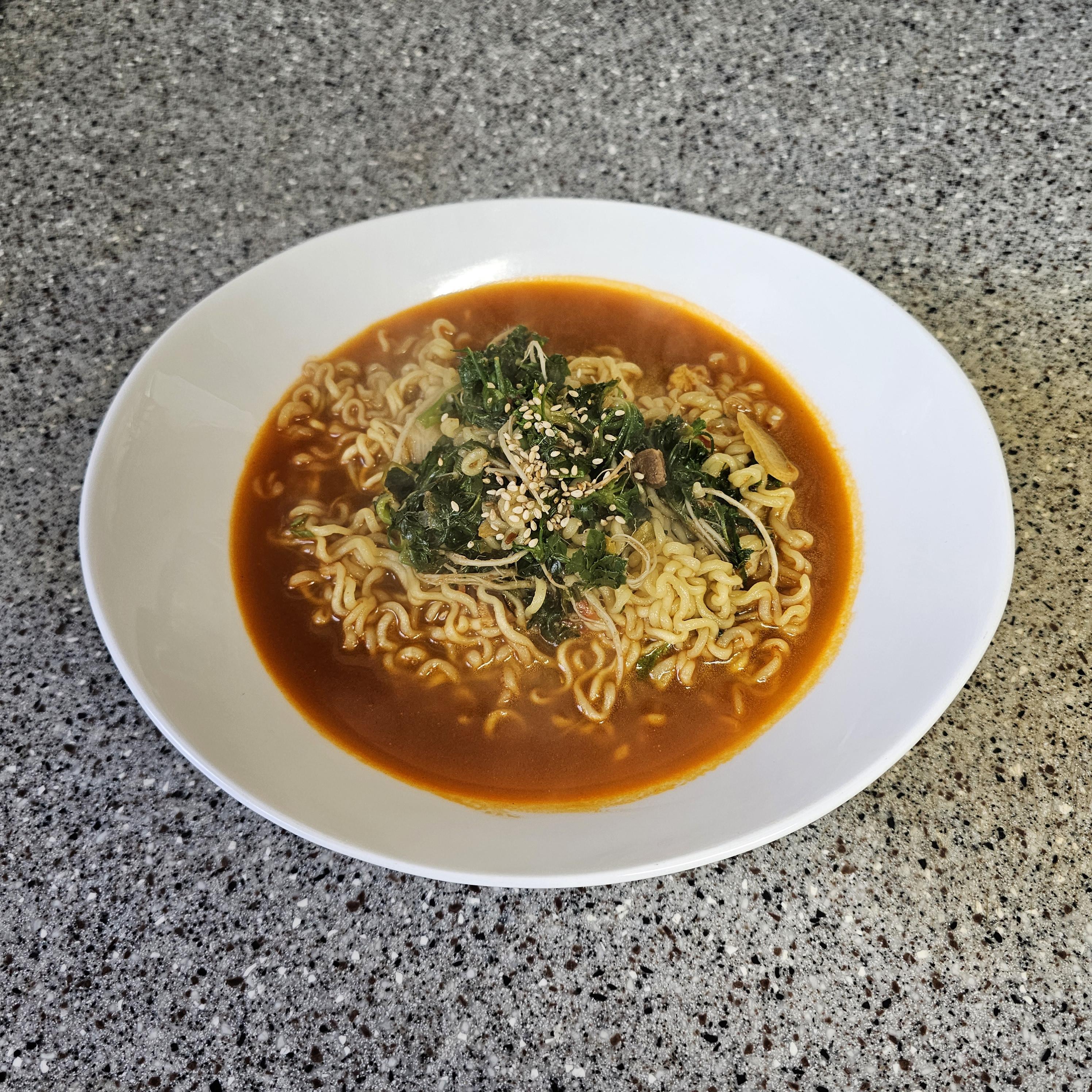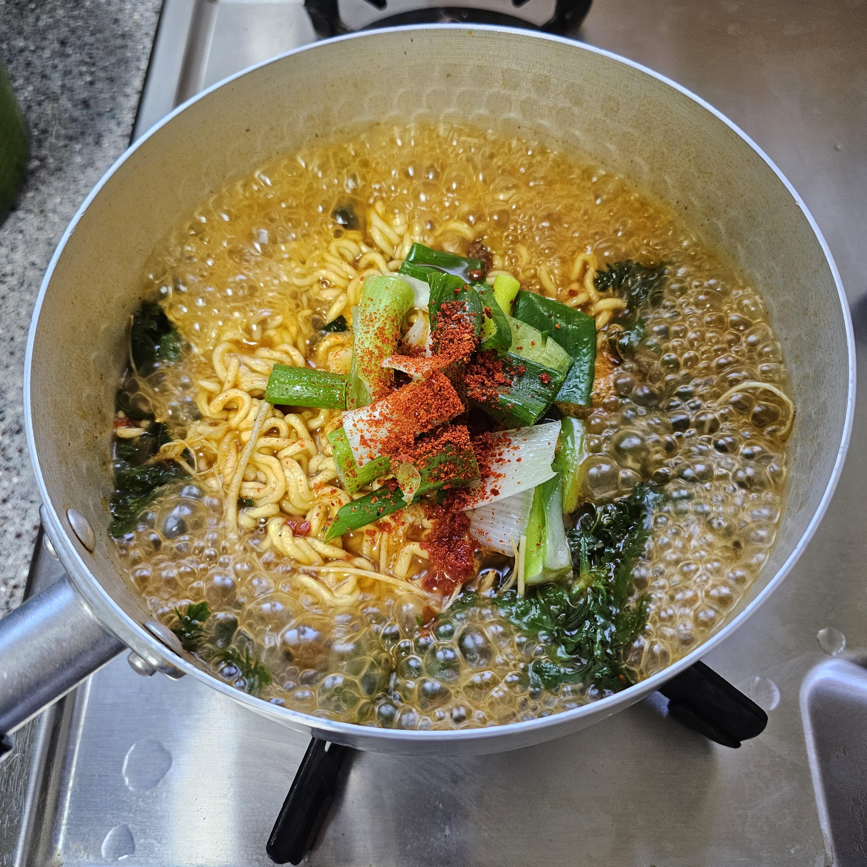신라면(라면 아무거나 상관없음), 냉이, 다진 마늘, 고춧가루, 파, 깨