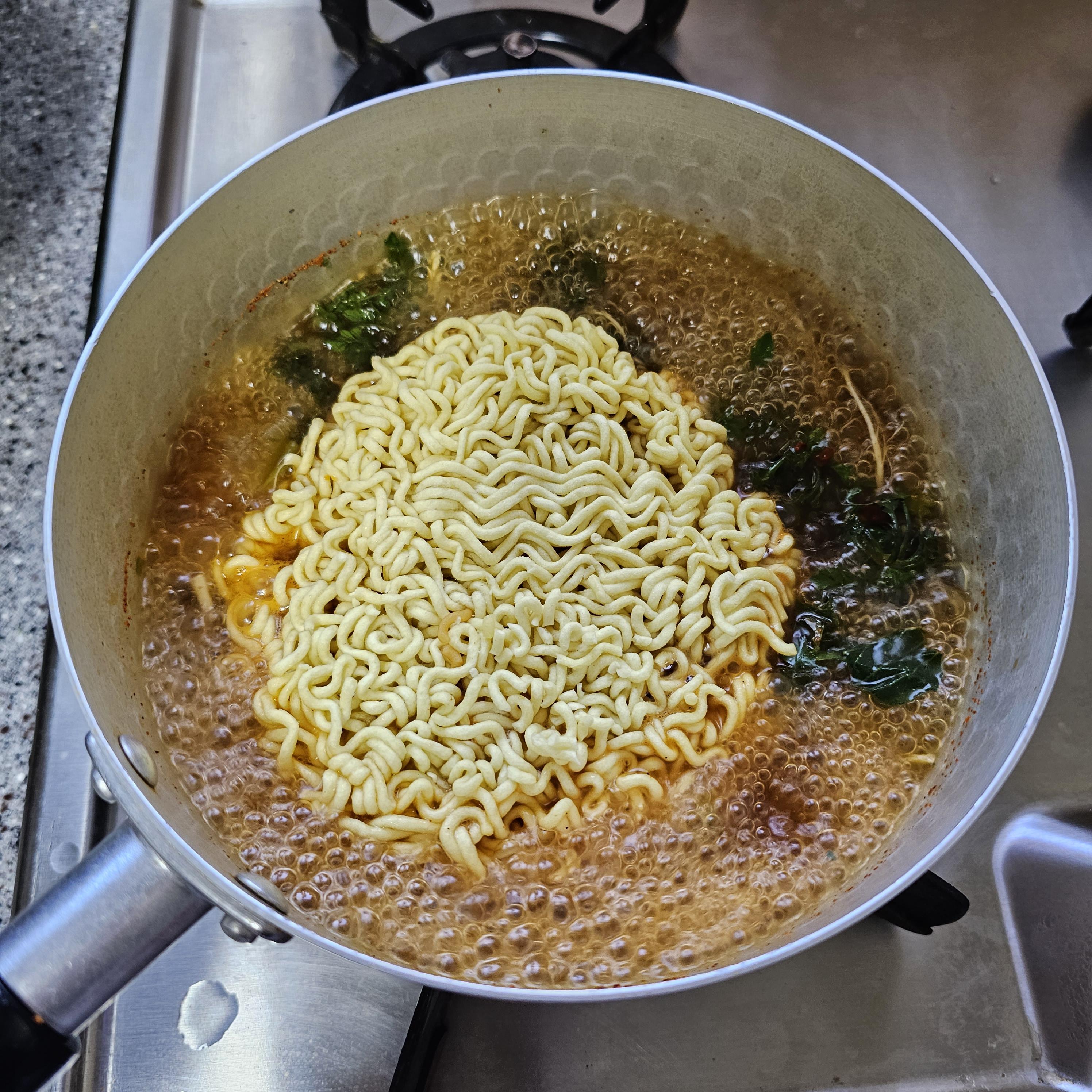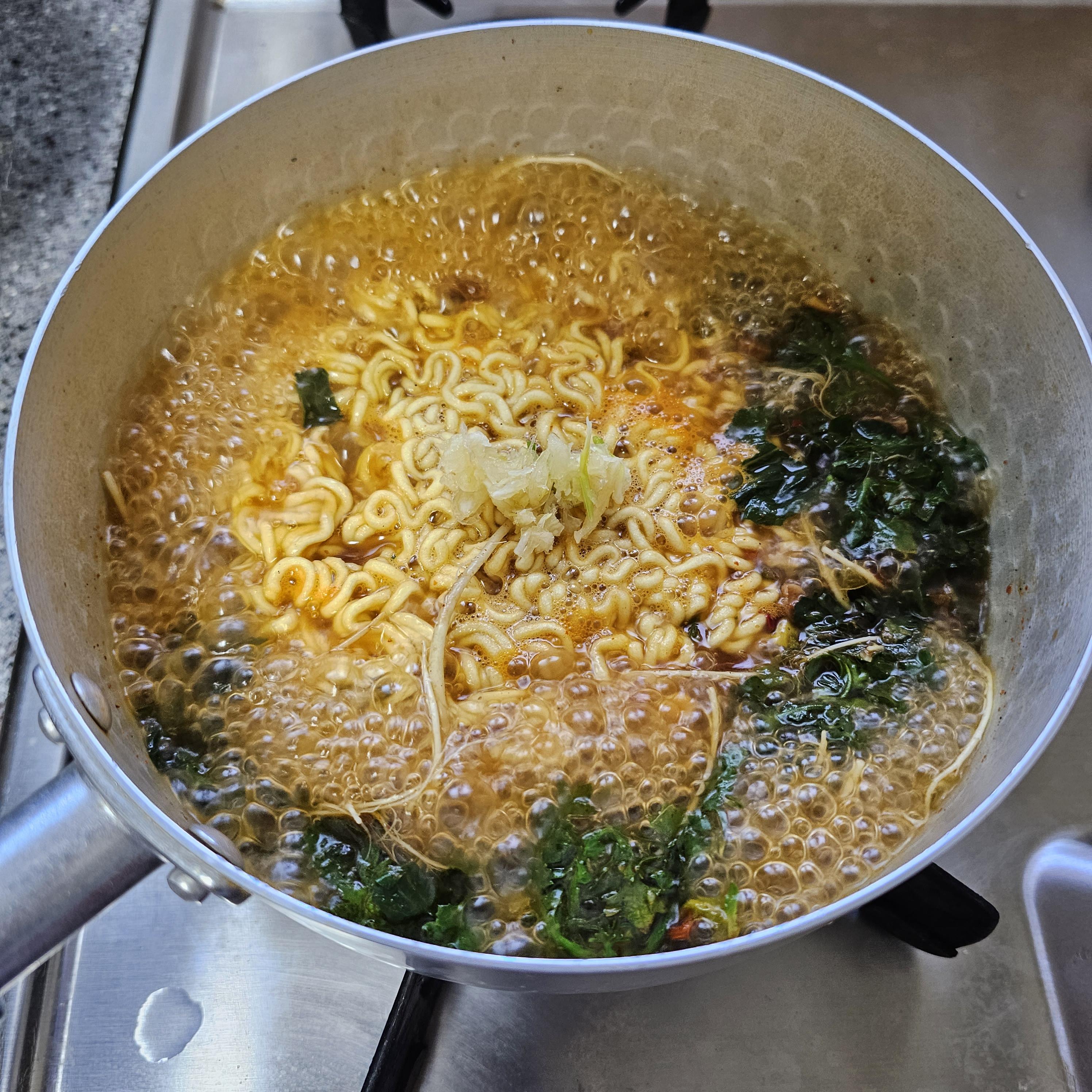 냉이를 넣고 물이 끓으면 라면사리를 넣어줍니다.
