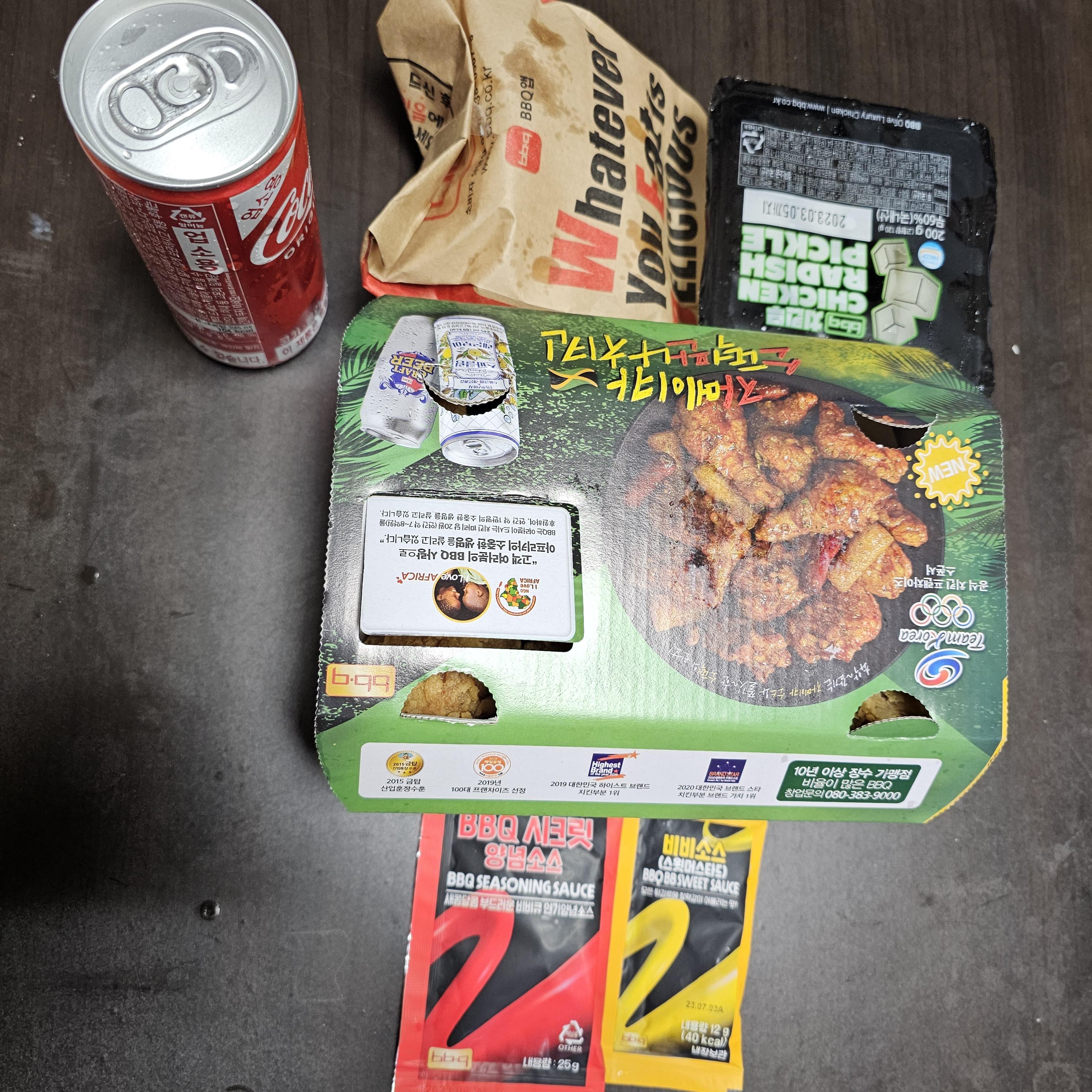 콜라, 크림치즈볼, 치킨 무, 양념소스, 비비소스, 황금올리브닭다리 이렇게 들어 있습니다.