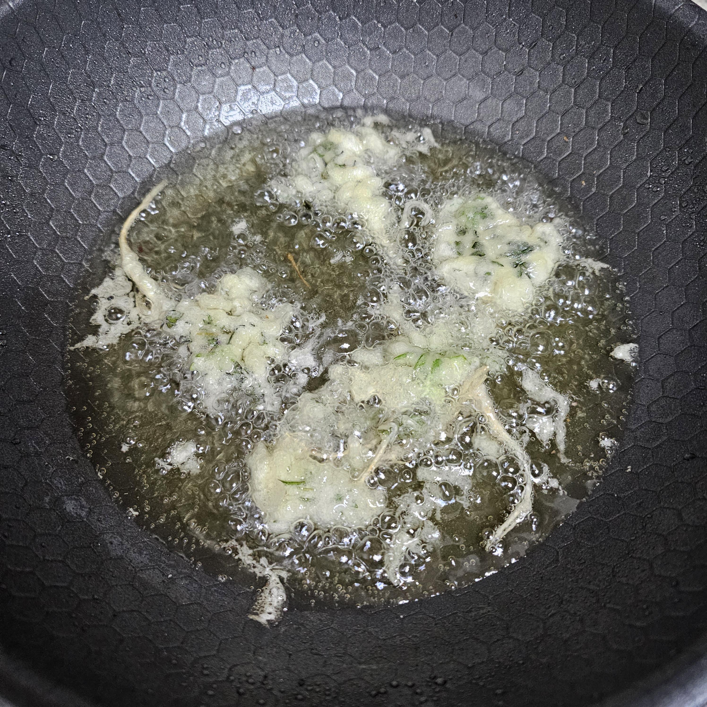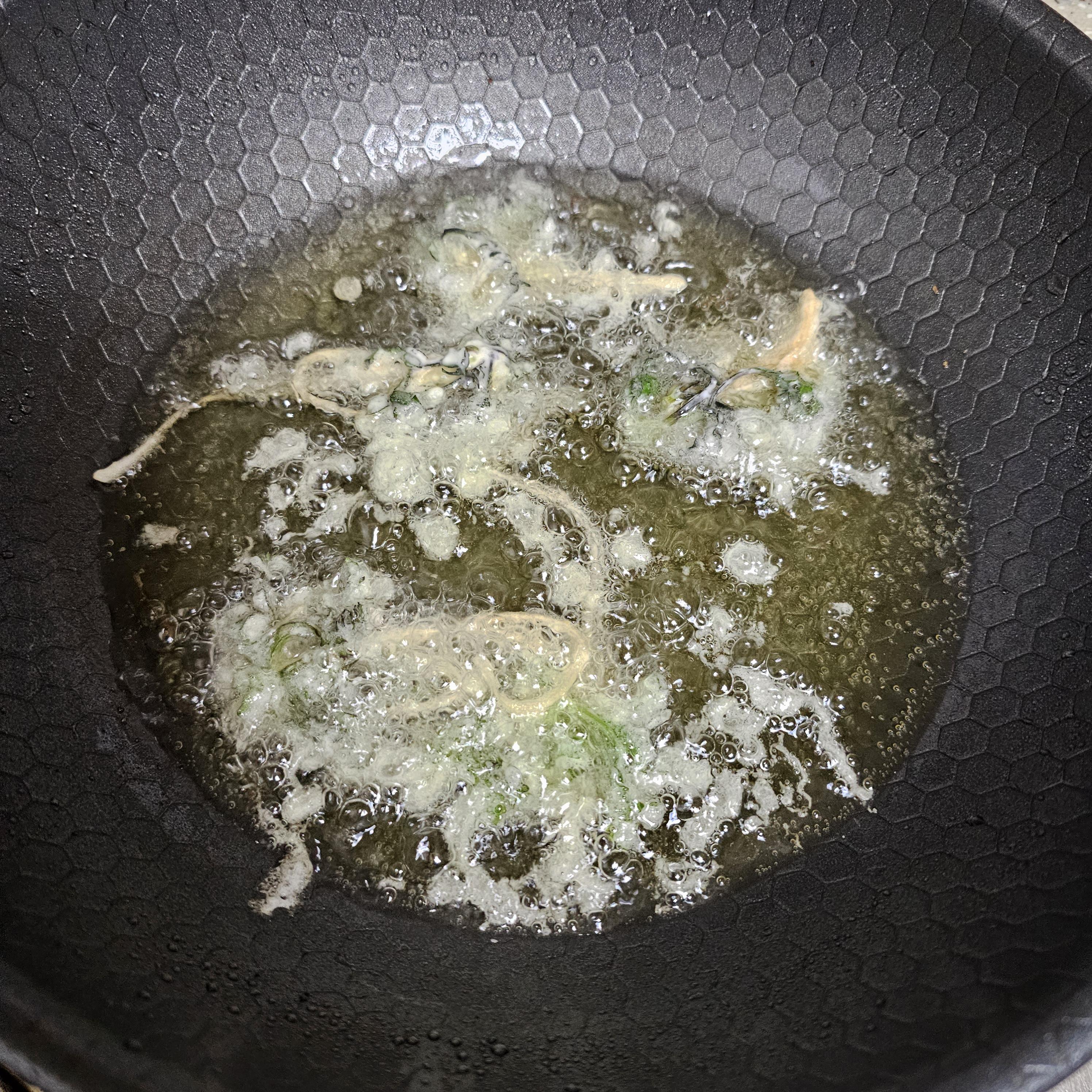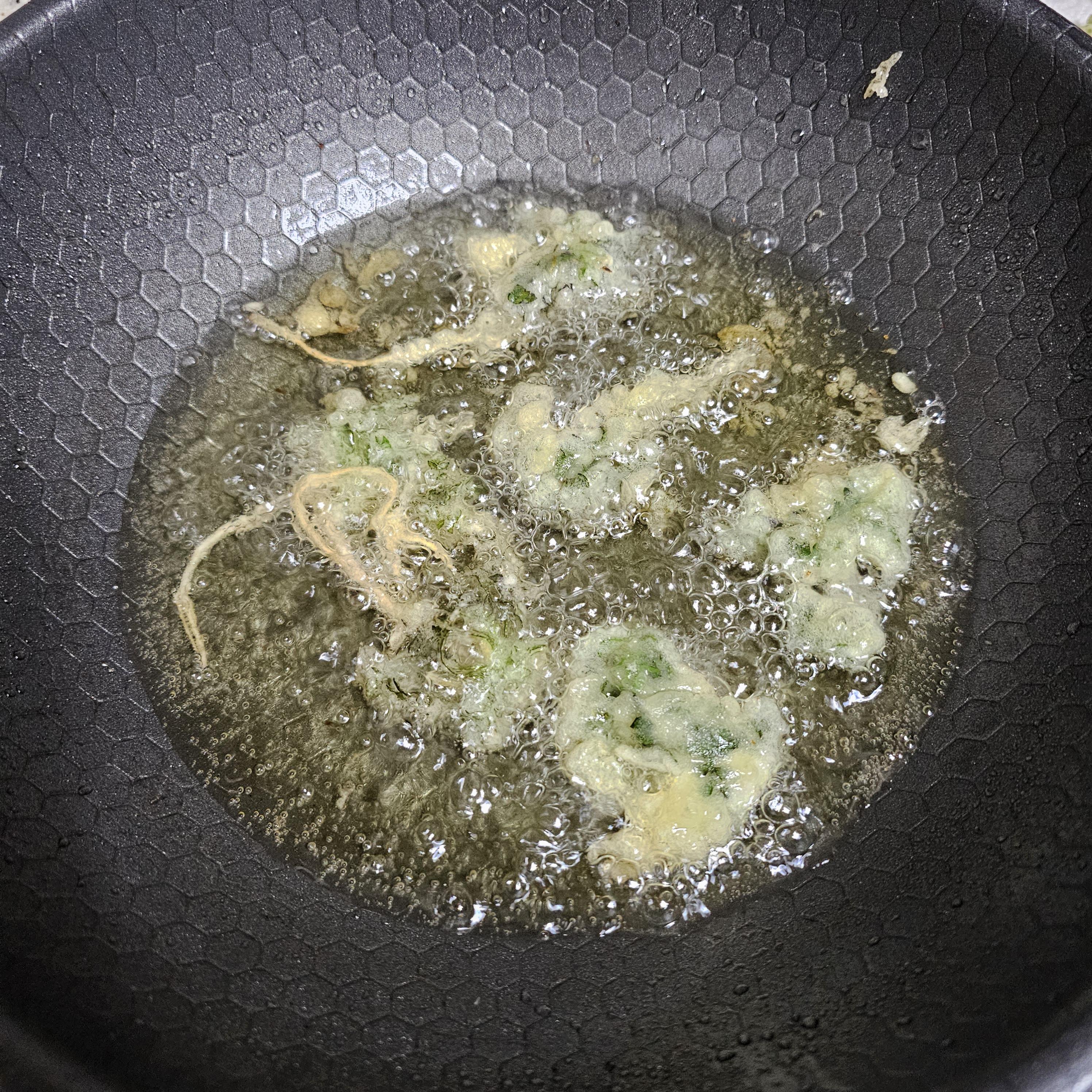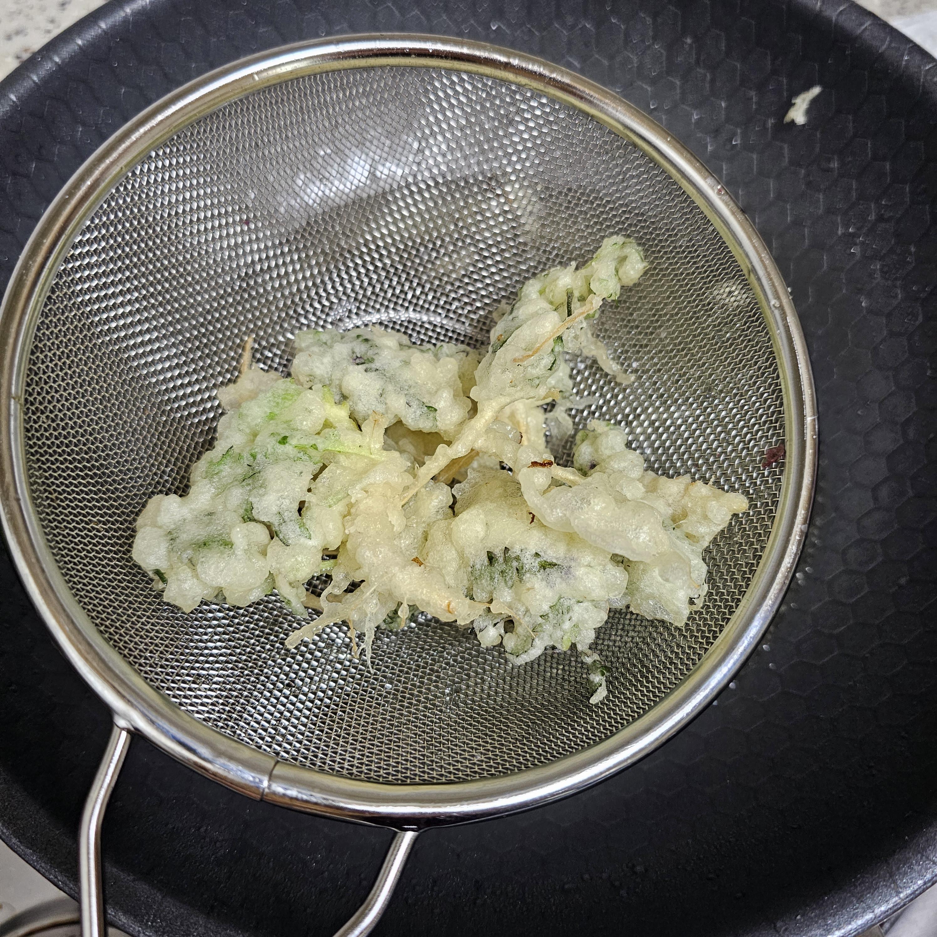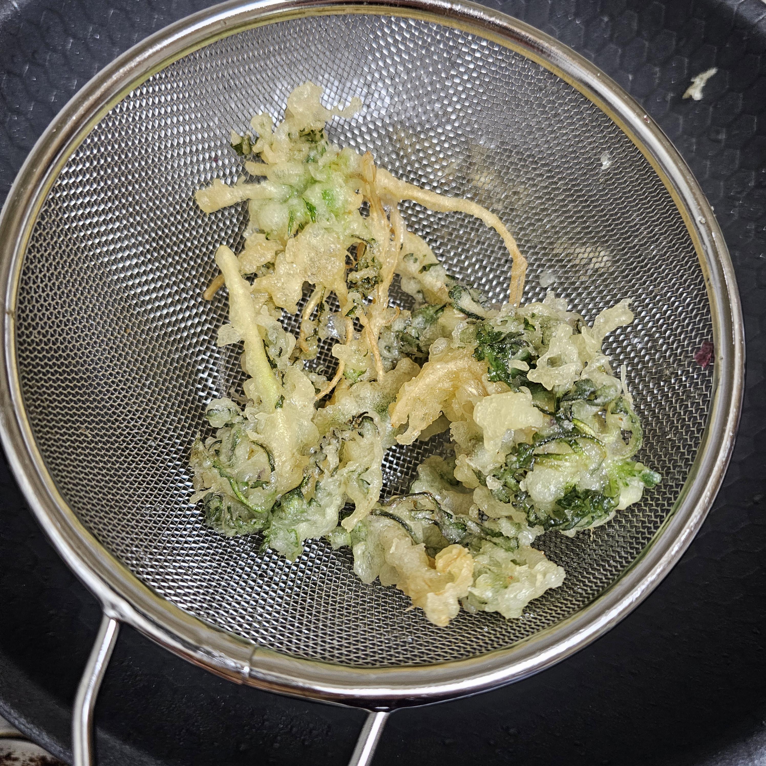 1차 튀기면 뜰채에 냉이 튀김을 건져놓고 기름이 빠지도록 기다려 줍니다.
