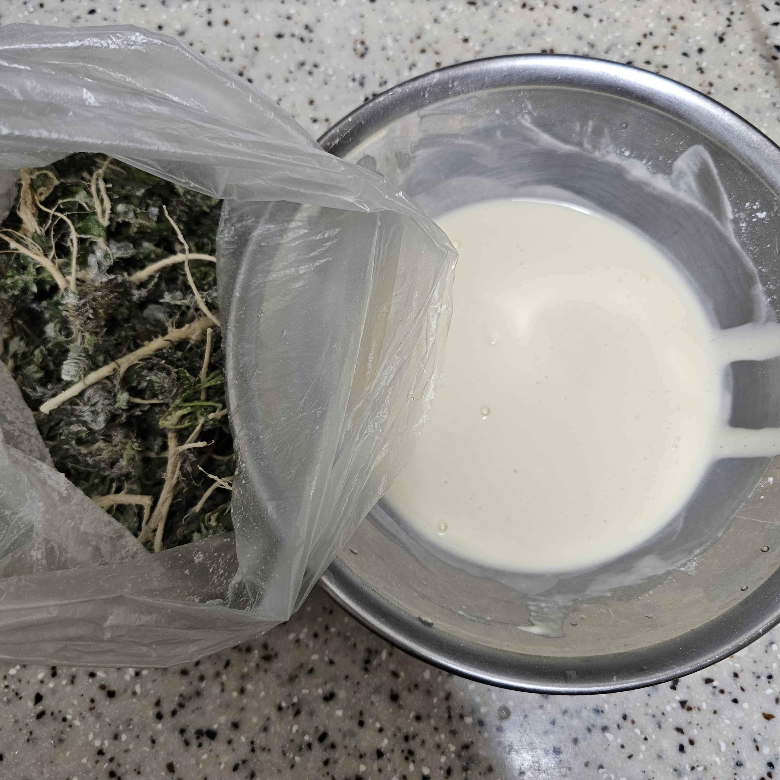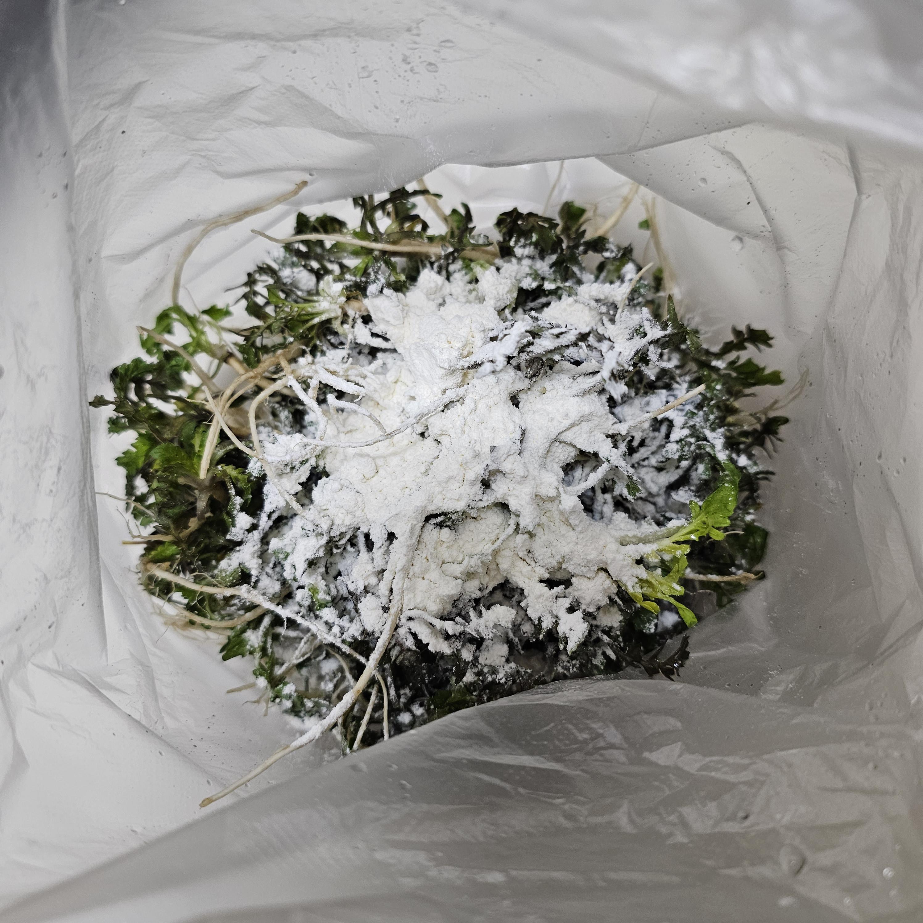 세척한 냉이를 봉지 안에 넣고 튀김 가루를 조금 넣어줍니다.