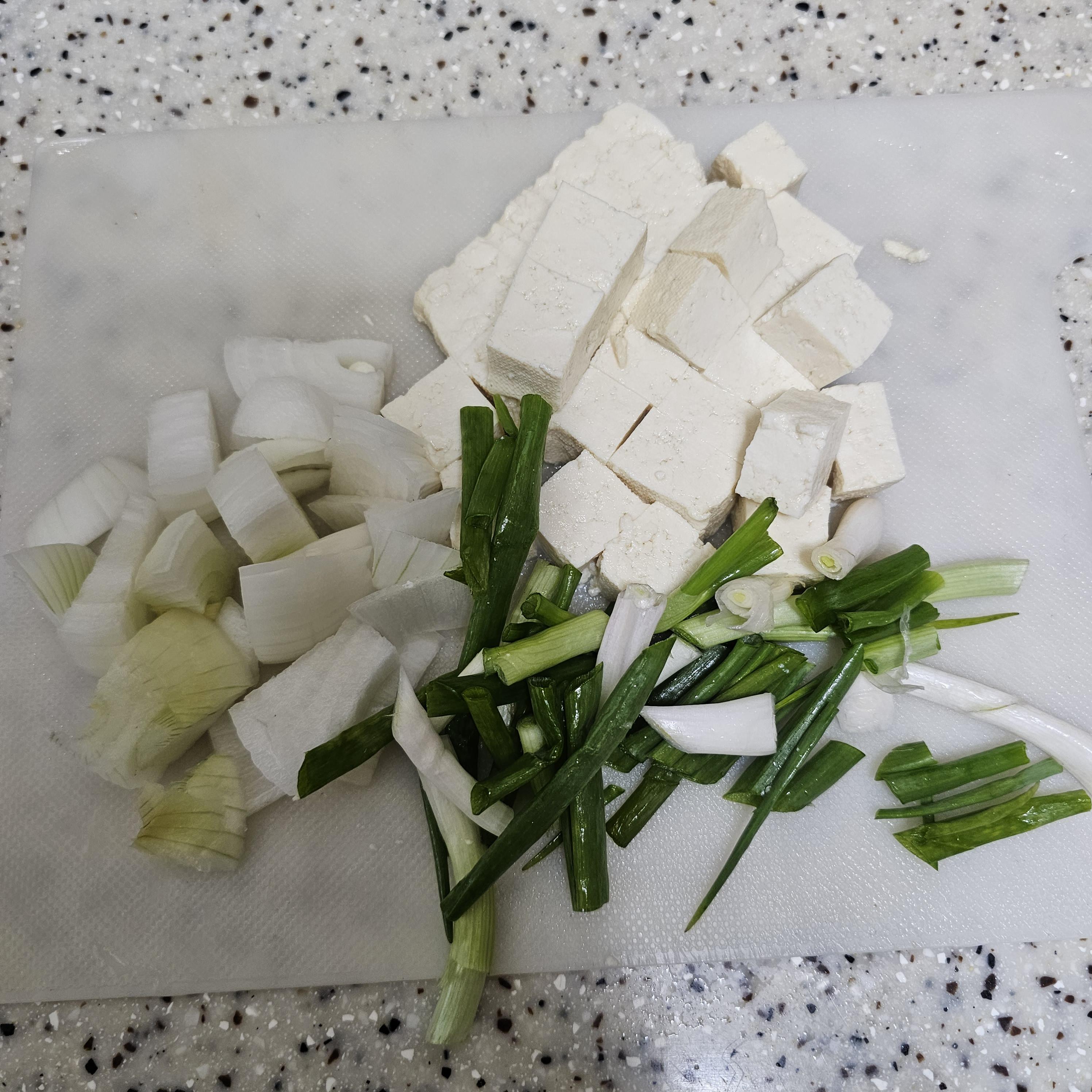국이 끓을 동안 양파, 두부, 쪽파를 먹기 좋은 크기로 잘라줍니다.
