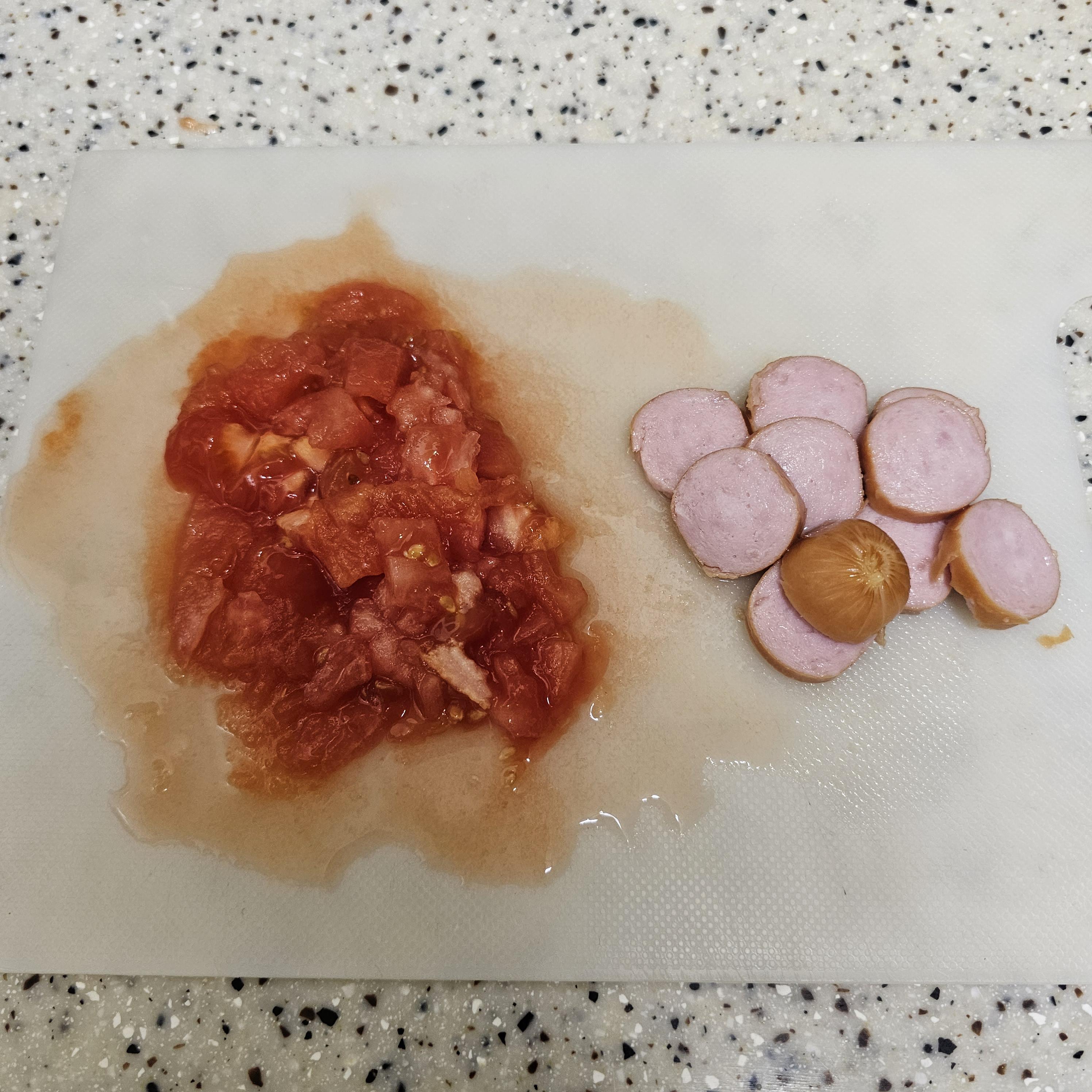 토마토 껍질을 제거해 잘게 썰어주었고 소시지도 먹기 좋은 크기로 잘라주었습니다.