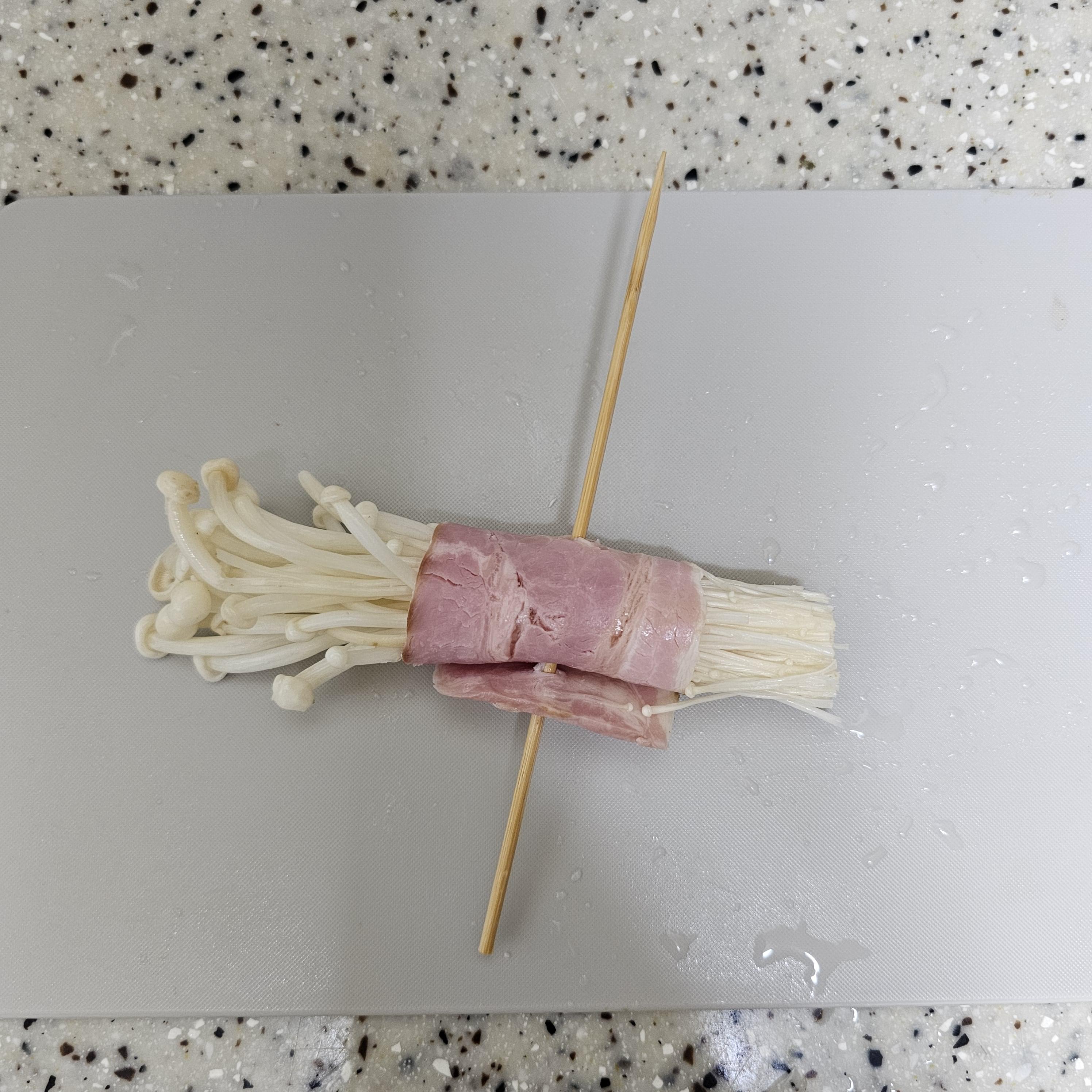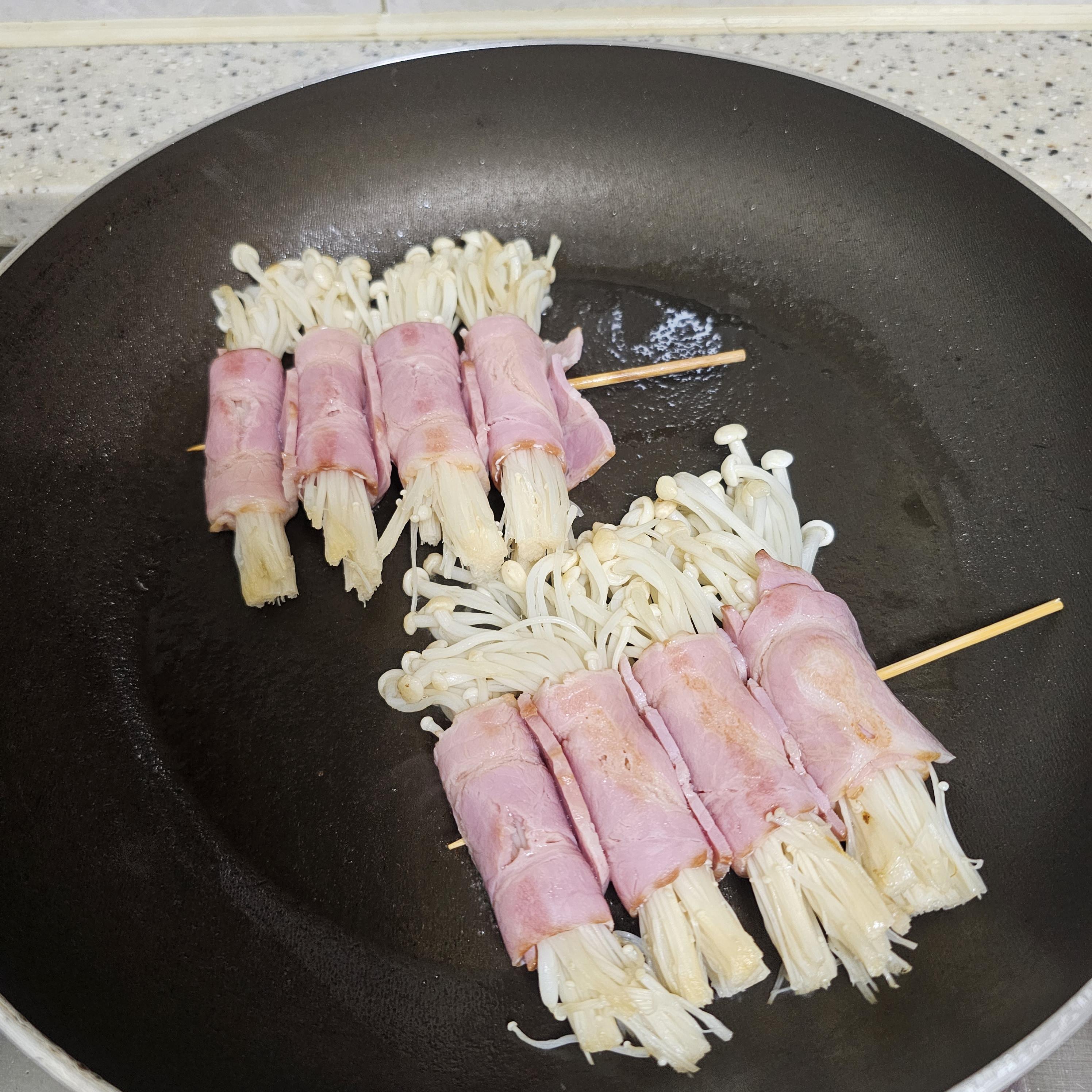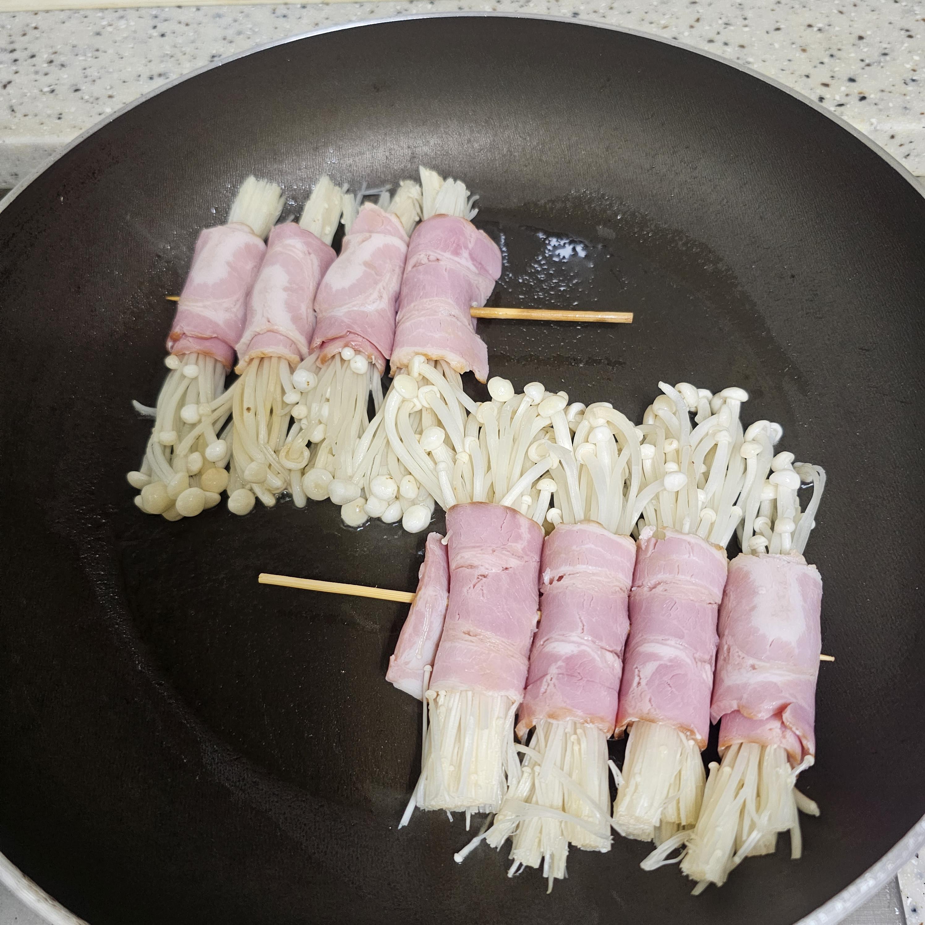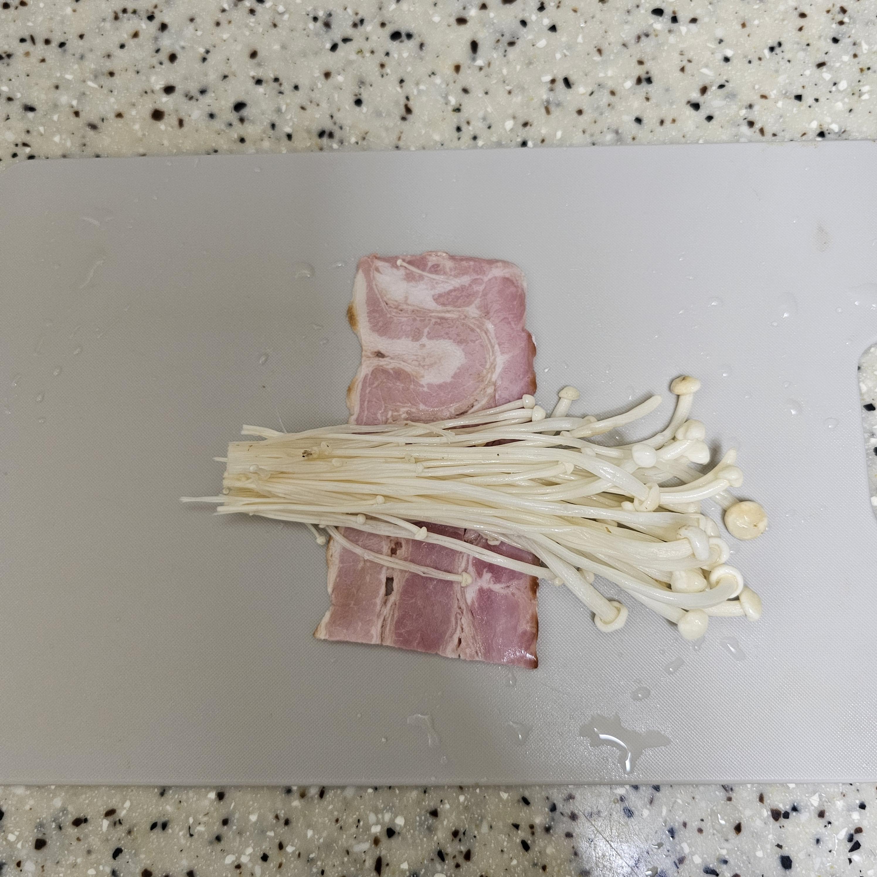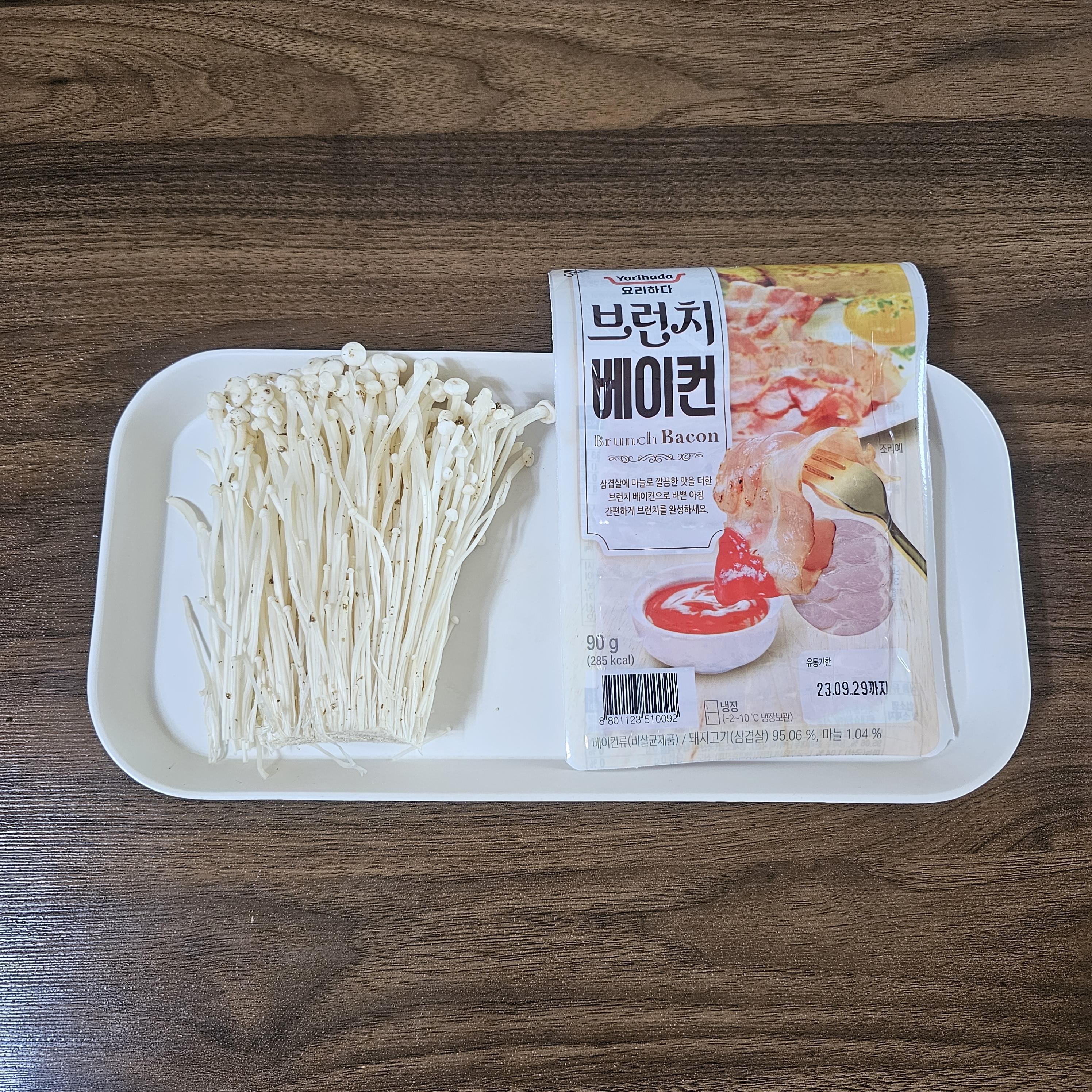 베이컨을 깔고 팽이버섯을 조금 올려줍니다.
