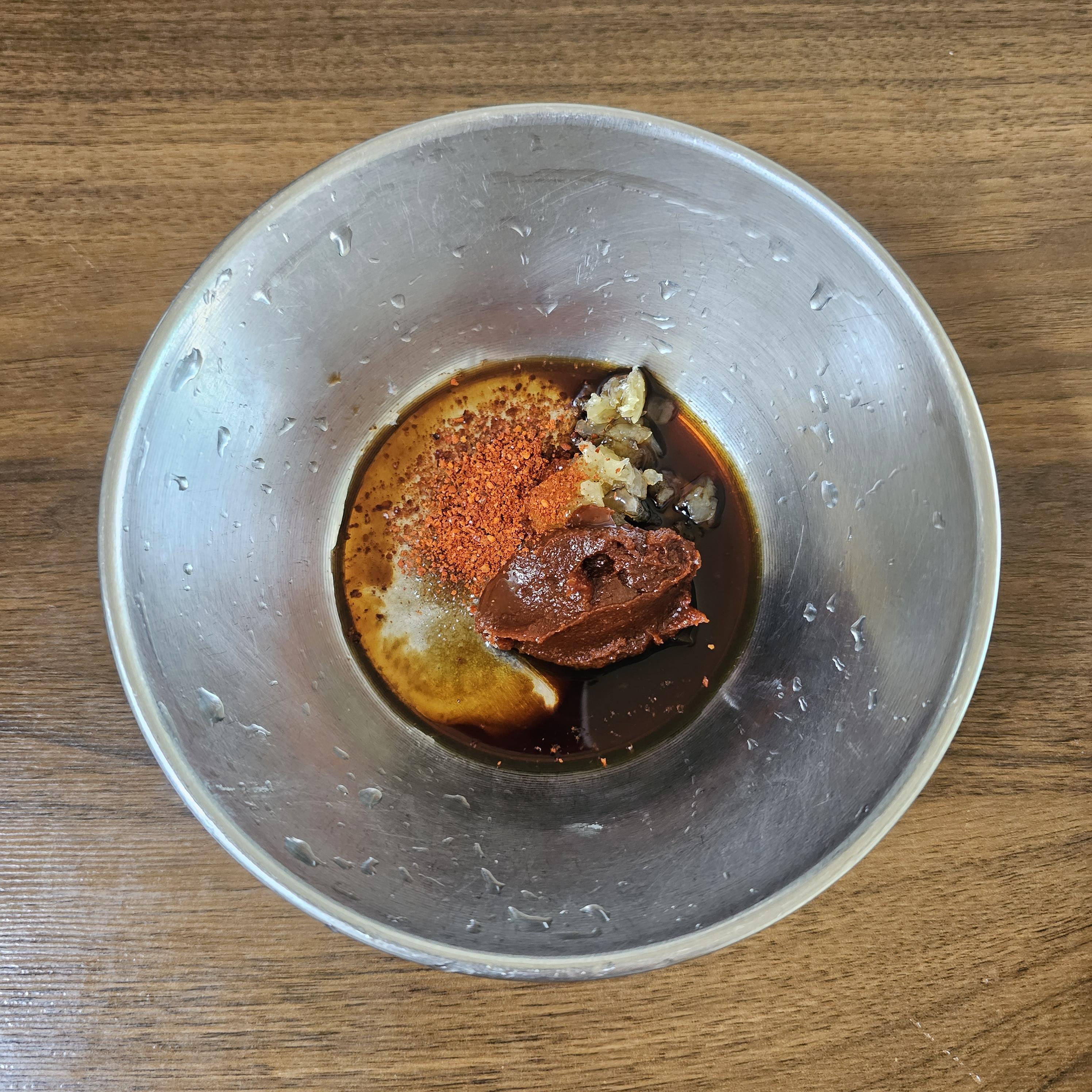 고춧가루 0.5, 고추장 1, 올리고당 1, 설탕 0.5, 굴소스 0.5, 다진 마늘 1, 간장 1, 후추