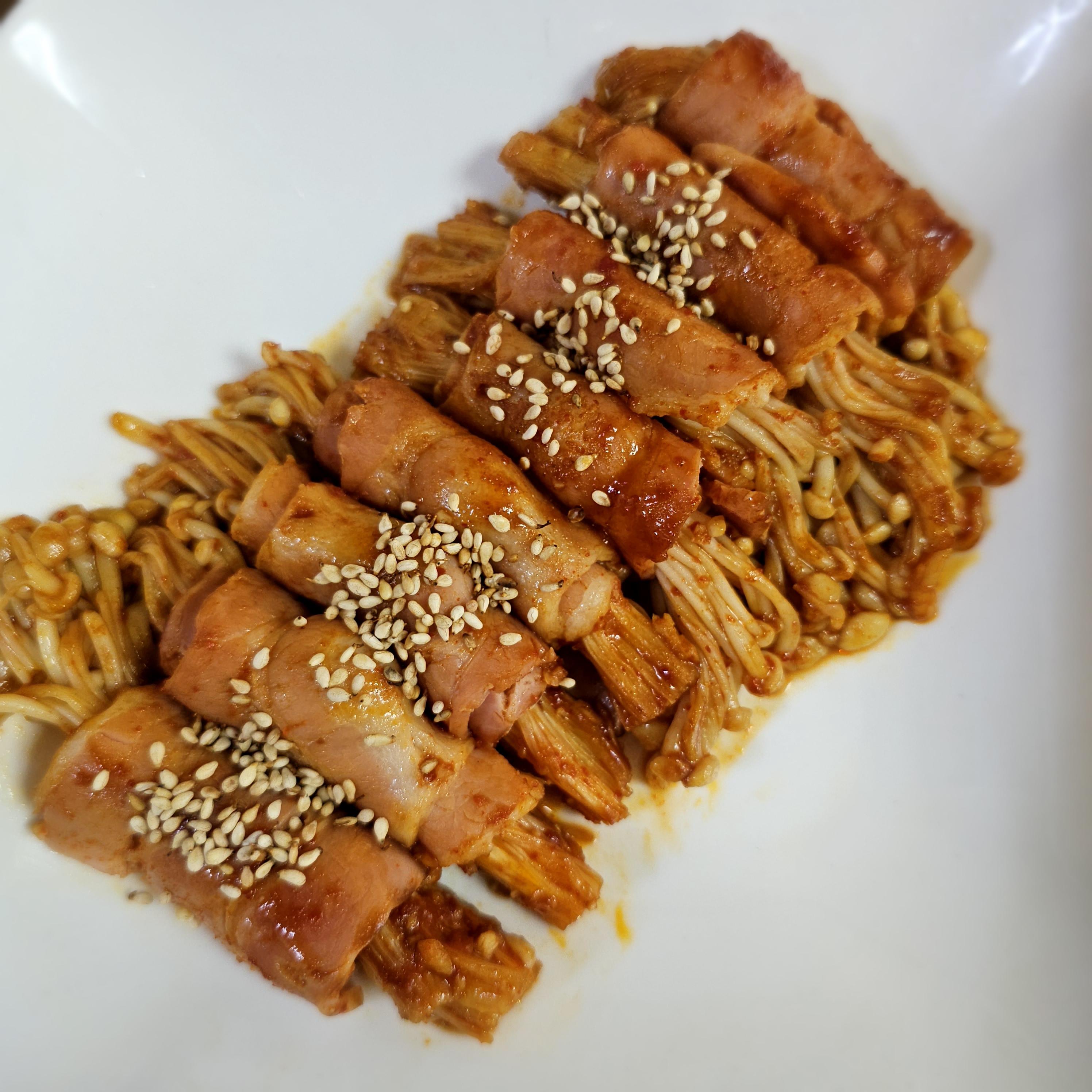 이렇게 맛있는 매콤 팽이버섯 베이컨 말이가 완성되었습니다.