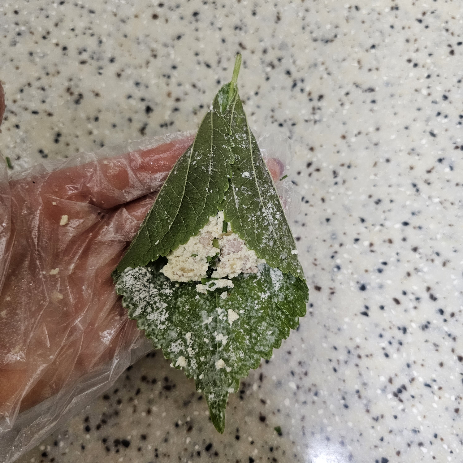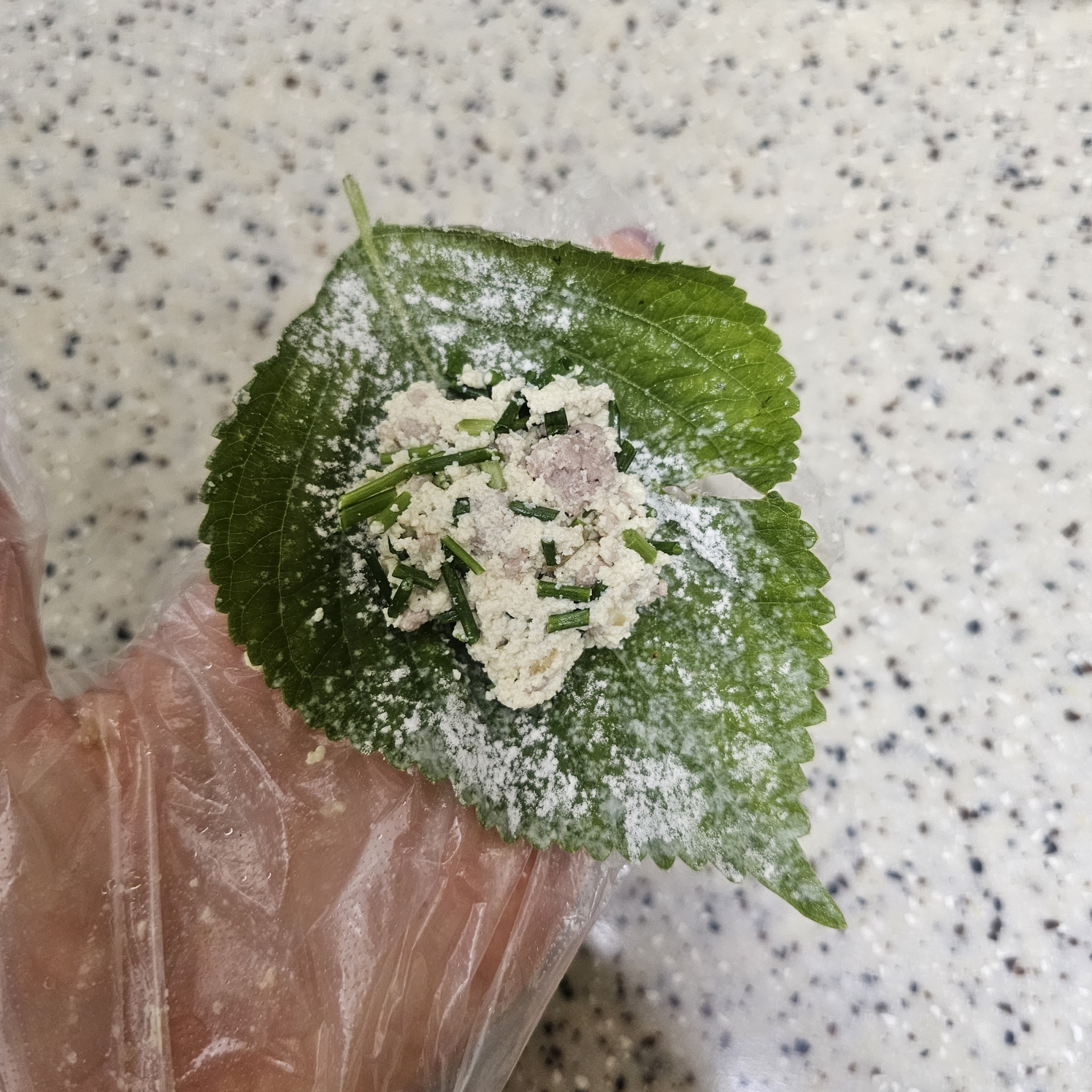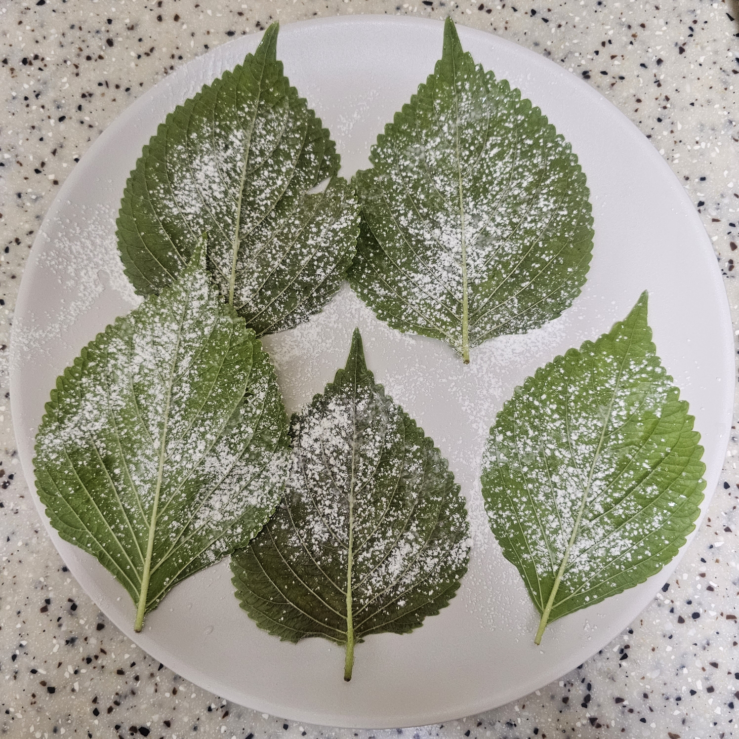 깻잎 1장씩 깔아 두고 체를 이용해 부침가루를 골고루 뿌려줍니다.