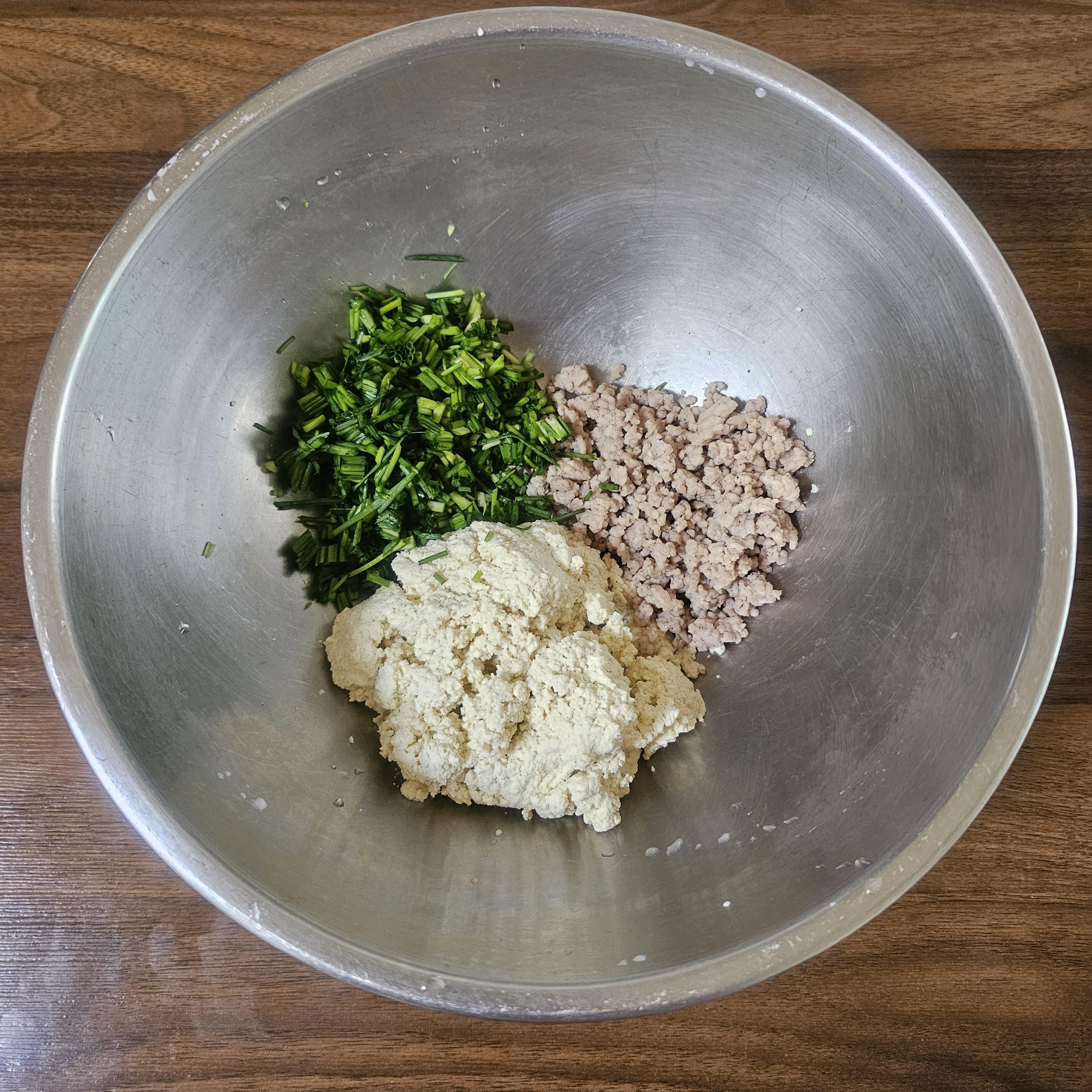 두부는 물기를 제거해 주고 다짐육은 볶아줍니다.