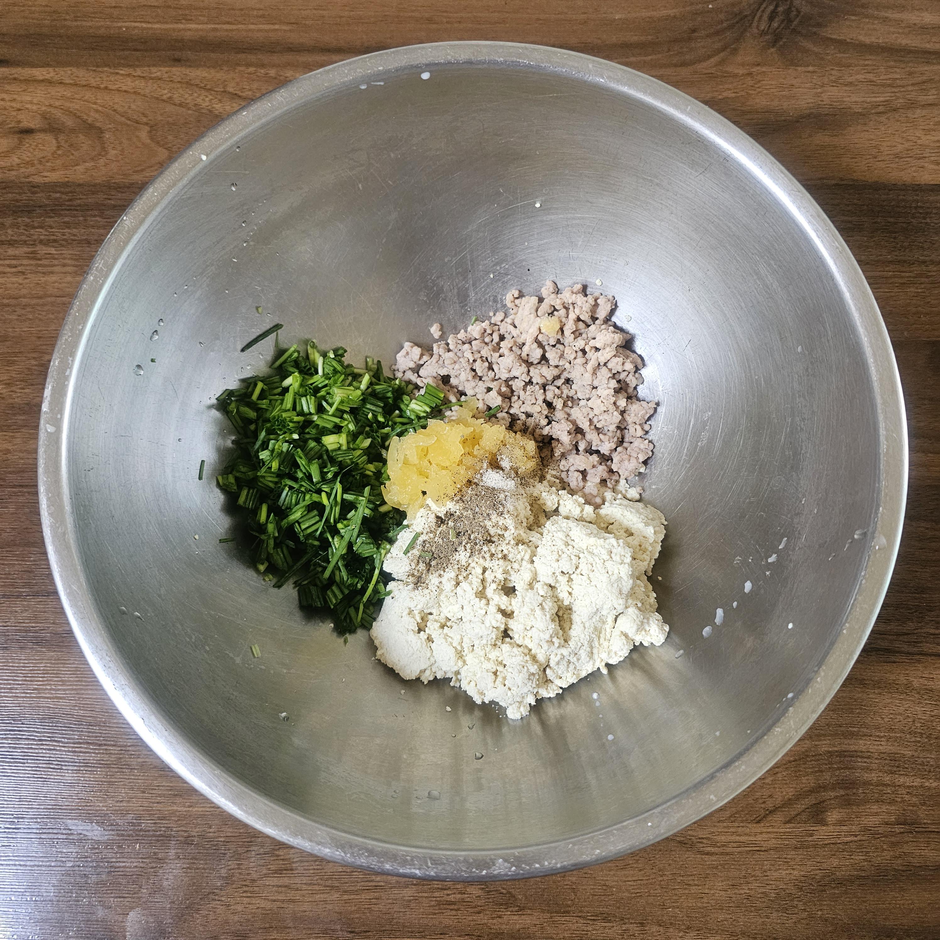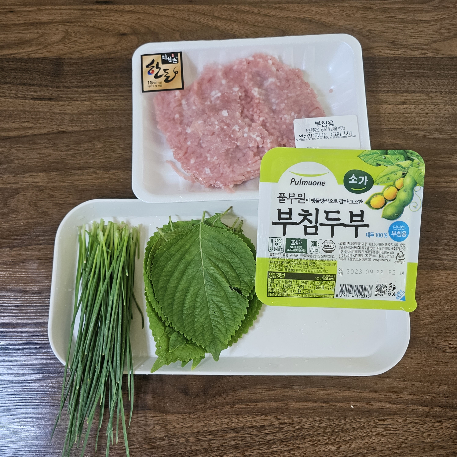 깻잎, 쪽파, 다짐육, 두부, 소금, 다진 마늘, 후추, 부침가루