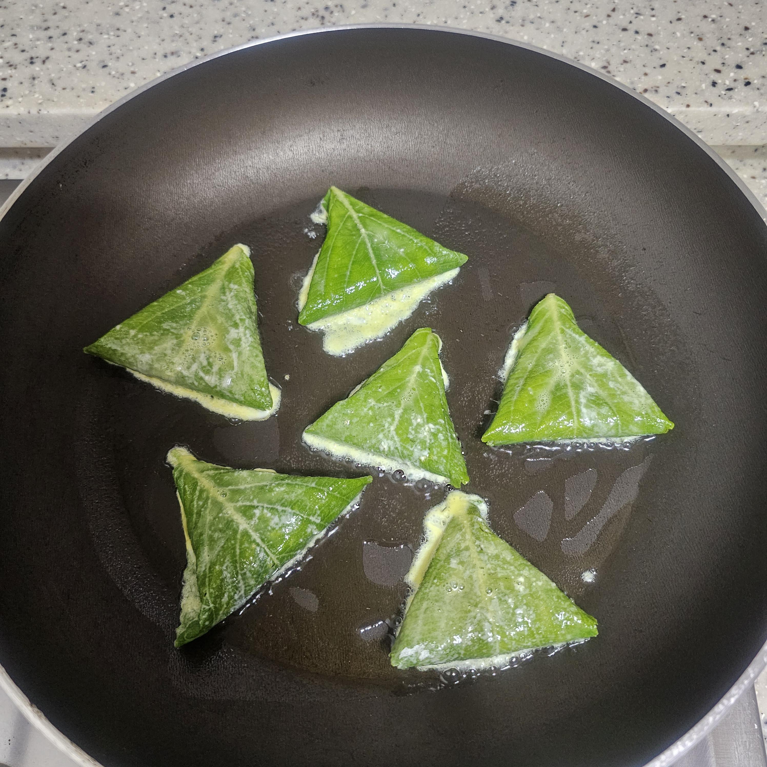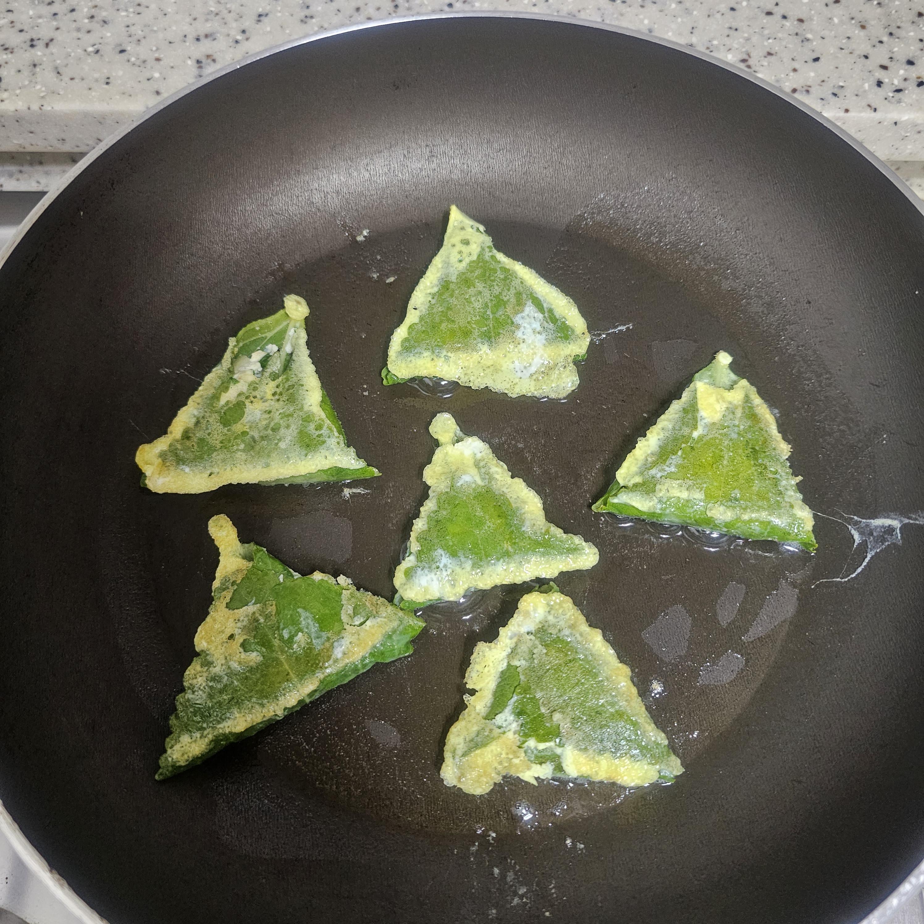 프라이팬에 식용유를 두르고 세모 깻잎을 올려줍니다.