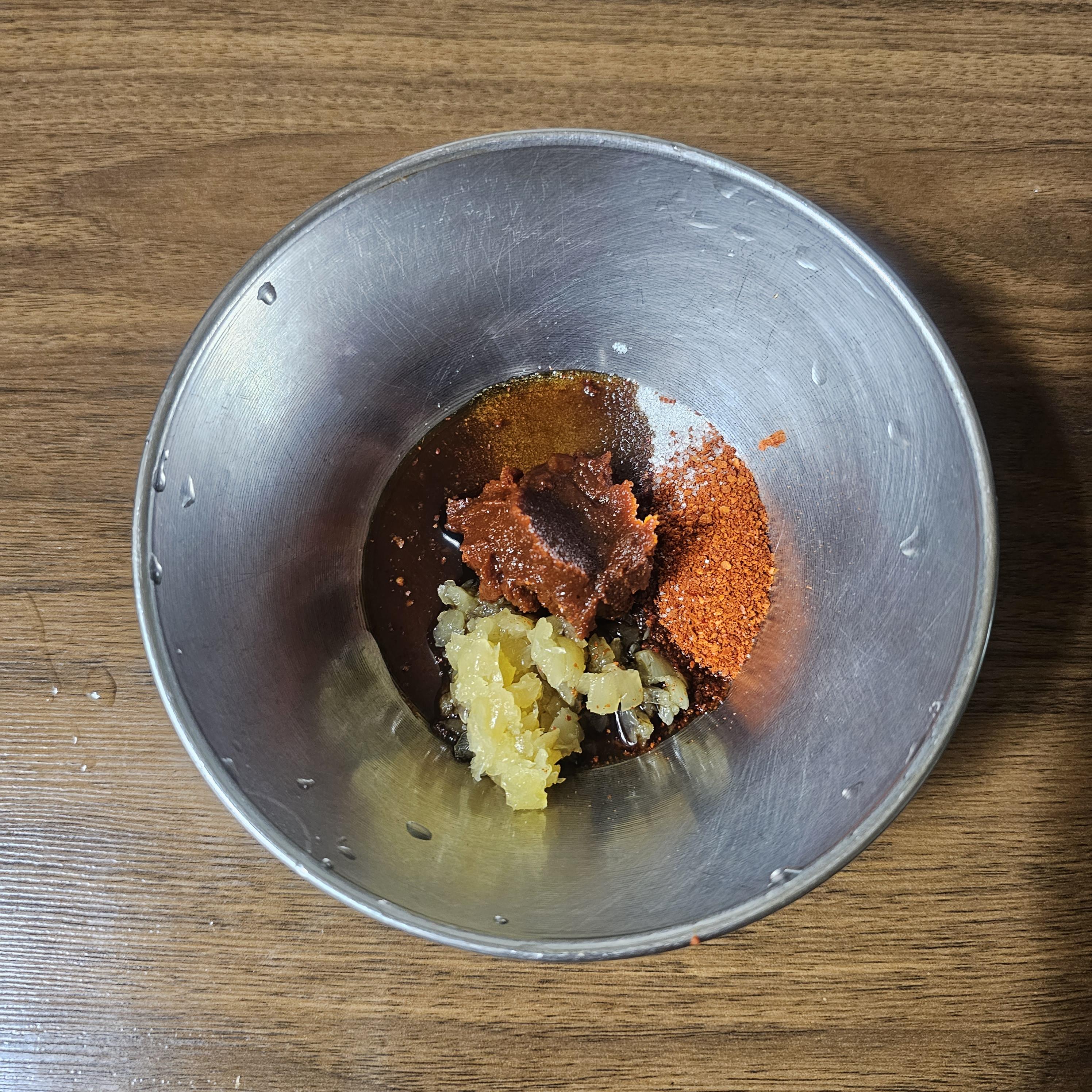 고추장 1, 고춧가루 2, 간장 1, 다진 마늘 1, 설탕 0.5~1, 맛술 1 넣고 양념장을 만들어줍니다.