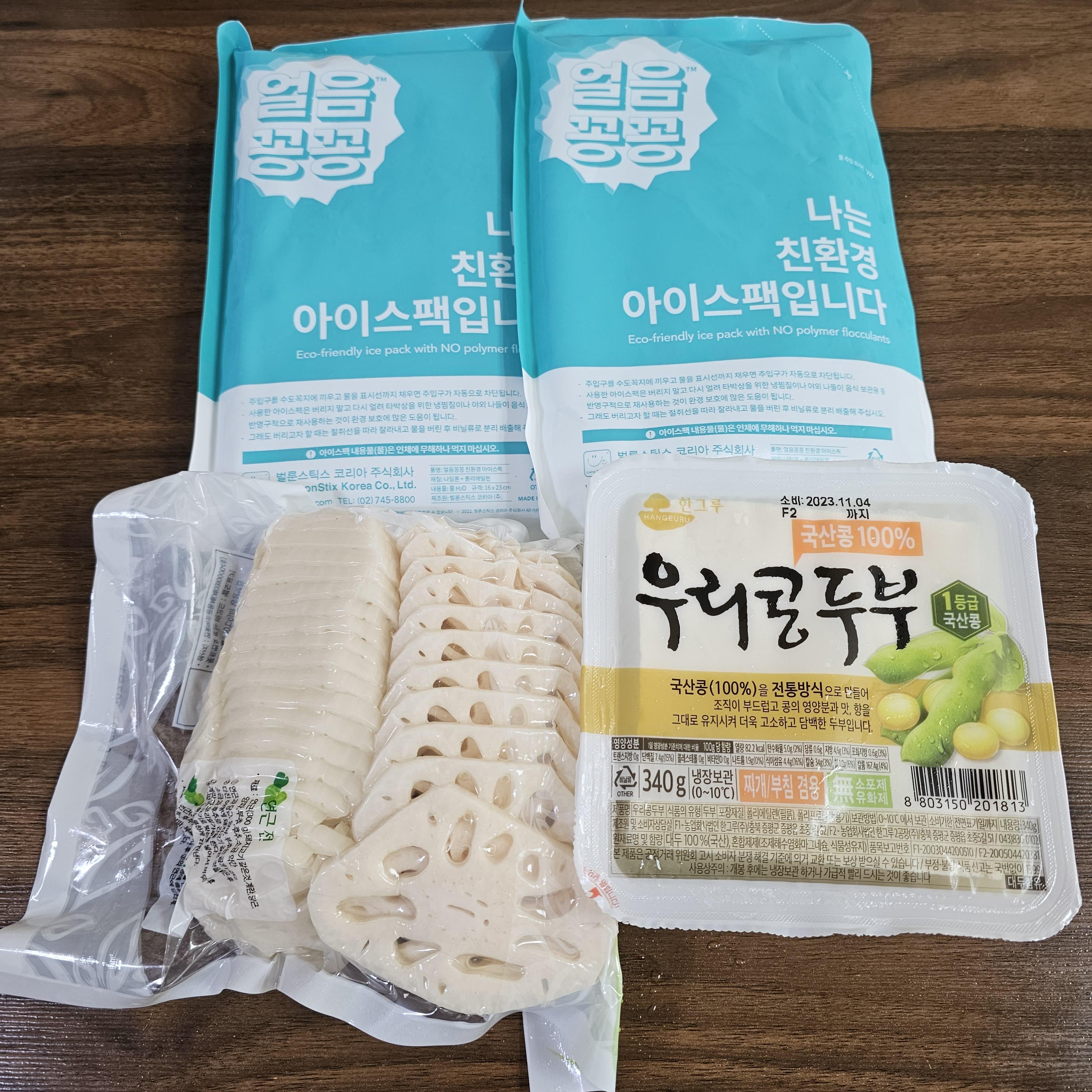은색 팩 안에는 아이스팩 2개와 손질된 연근과 두부가 담겨 있었습니다.