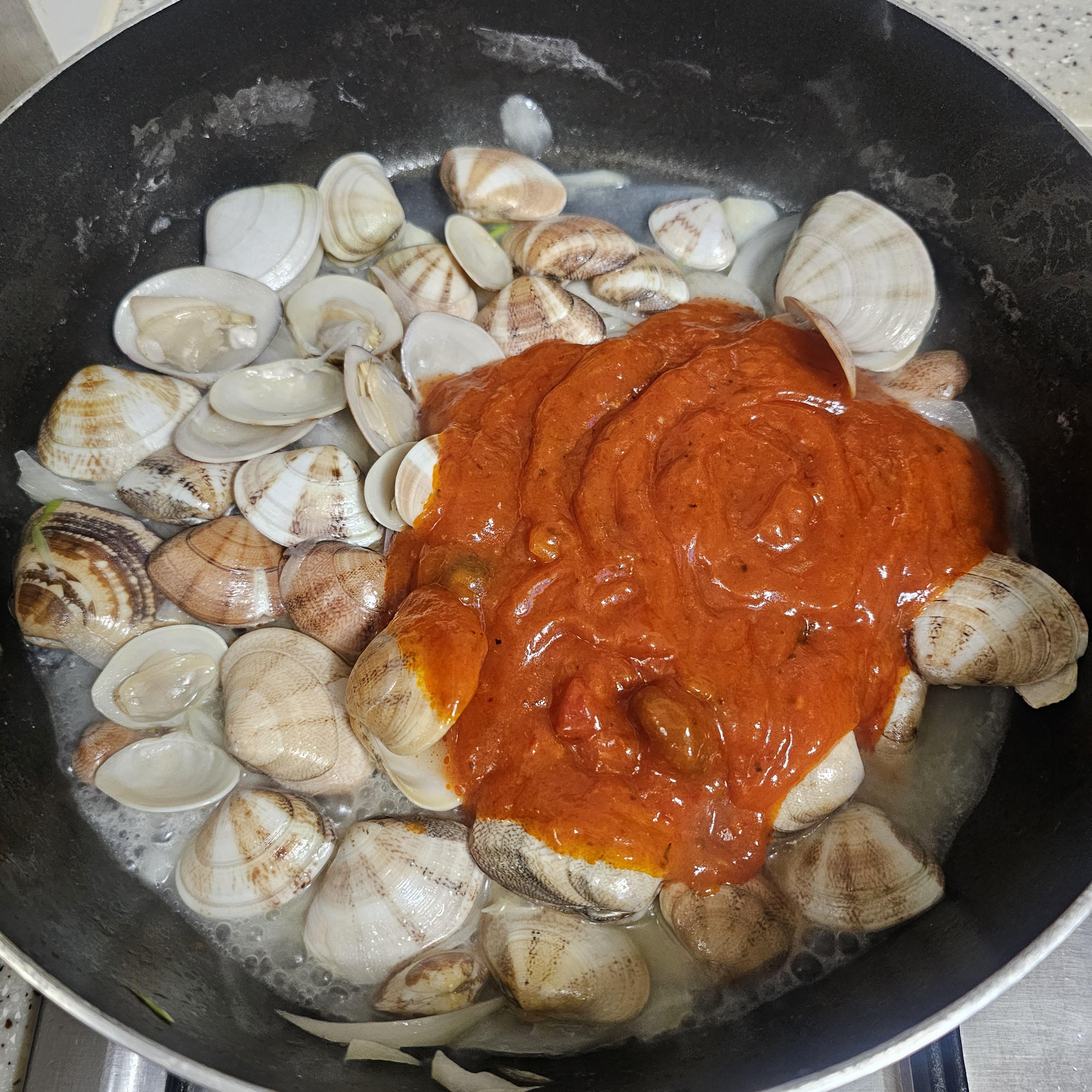 비단조개 입이 벌어지고 약간 물이 생기면 토마토소스를 넣어줍니다.