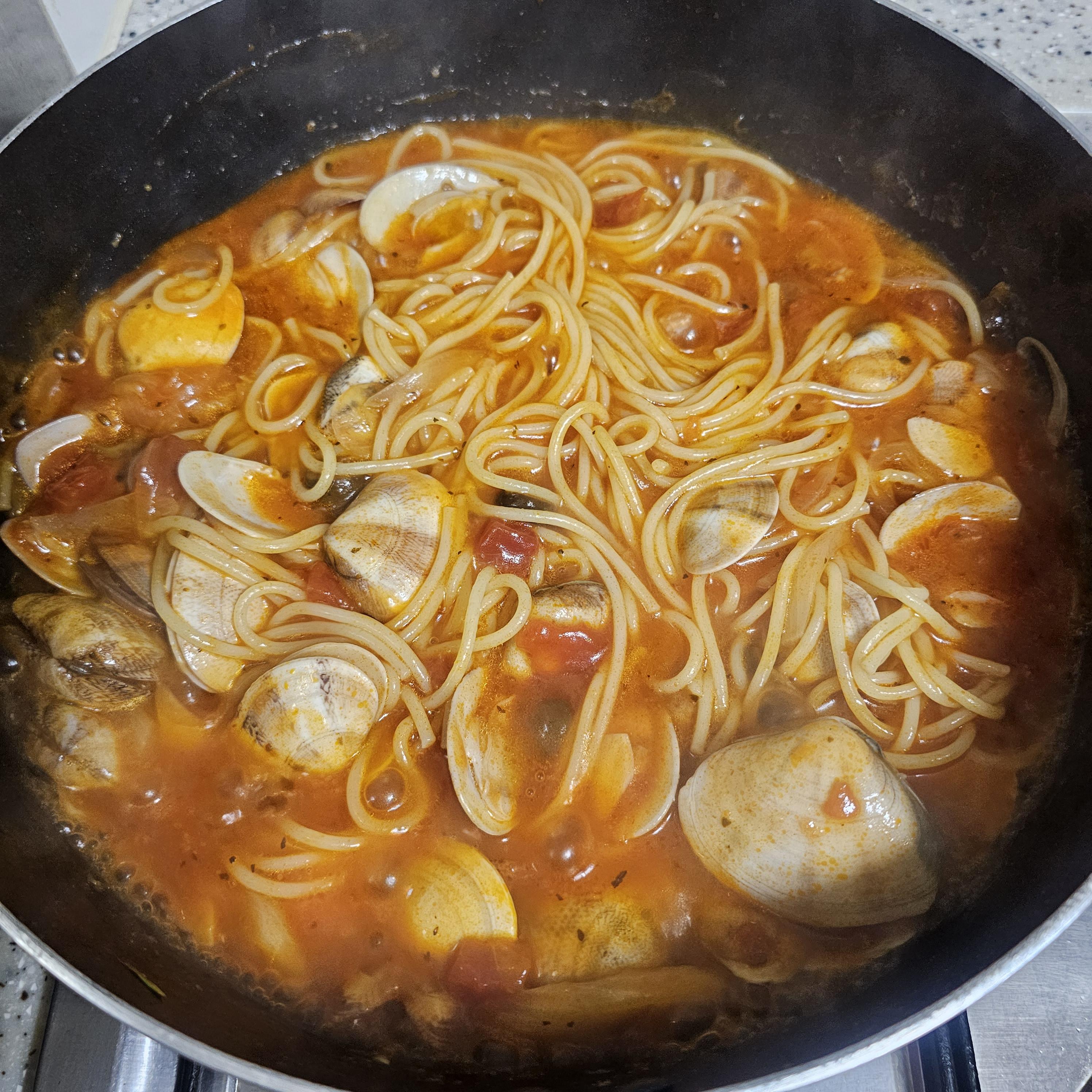 비단조개가 조금 있어서 간단하게 토마토 스파게티를 만들어 봤습니다.
