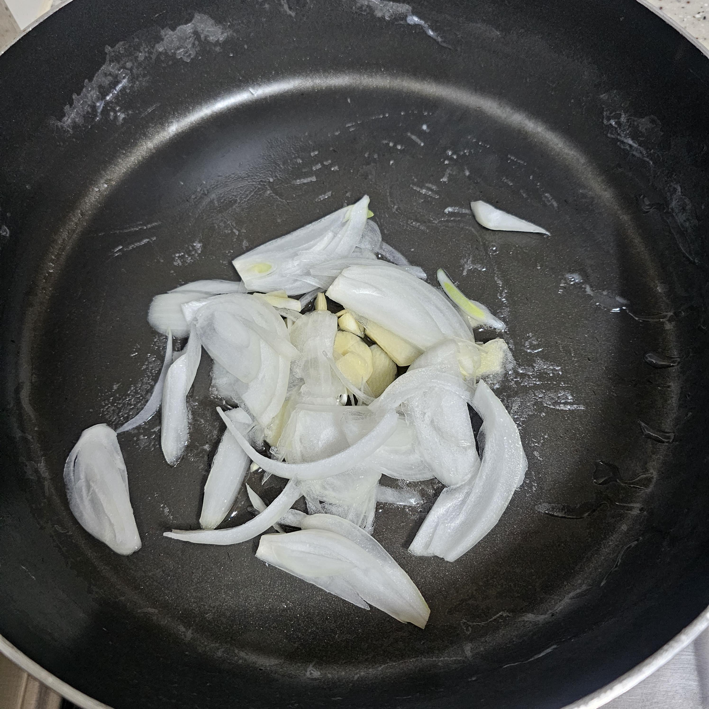 오일을 두르고 미리 손질해 두었던 양파와 마늘을 넣어 볶아줍니다.