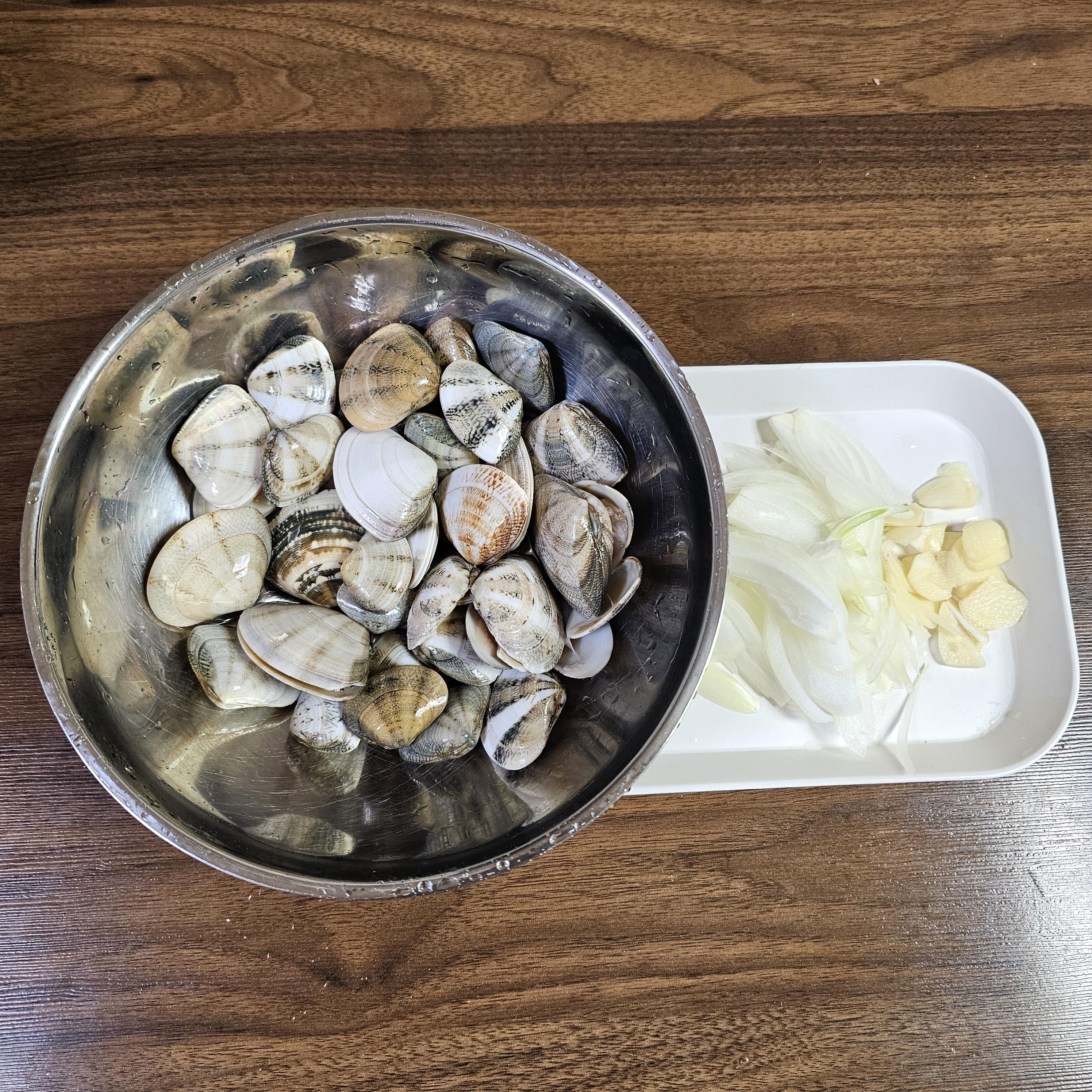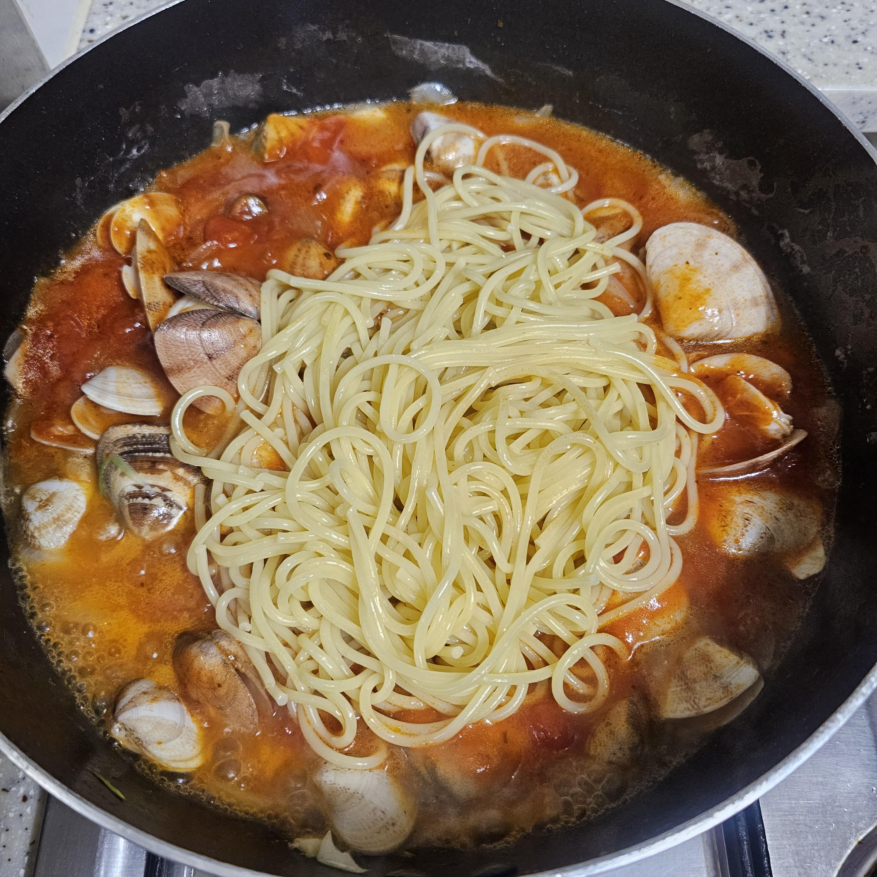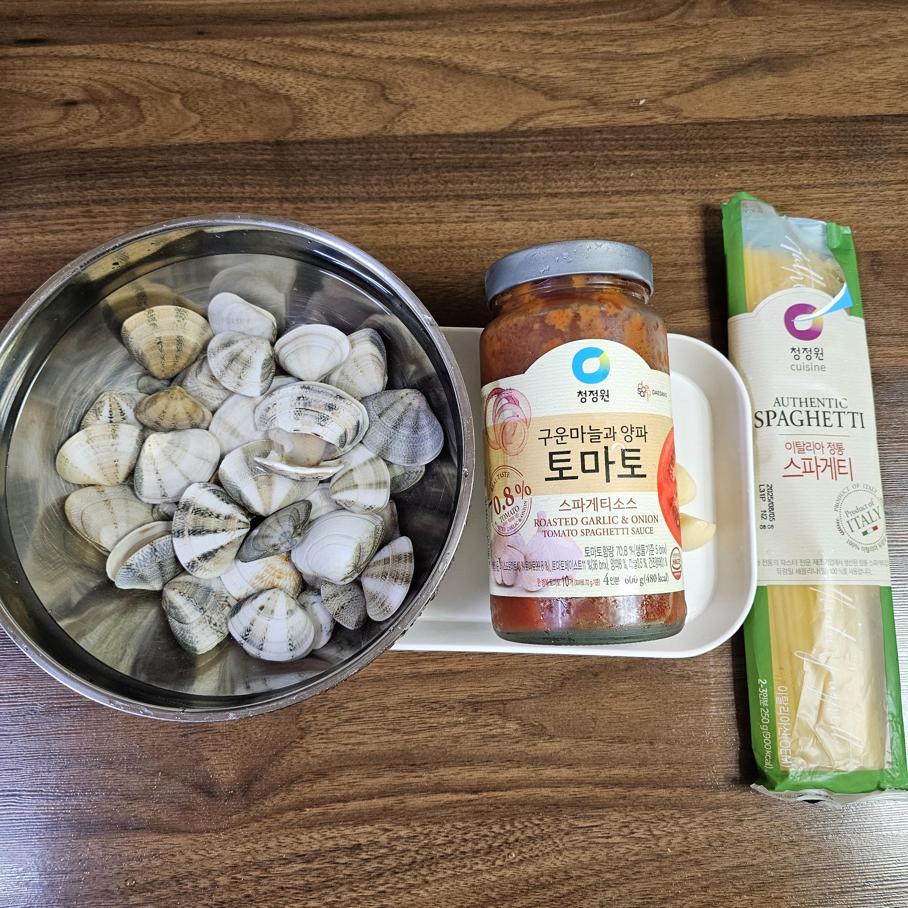 비단조개, 굵은소금, 토마토 스파게티 소스, 스파게티 면, 마늘, 양파, 파슬리, 화이트 와인, 오일