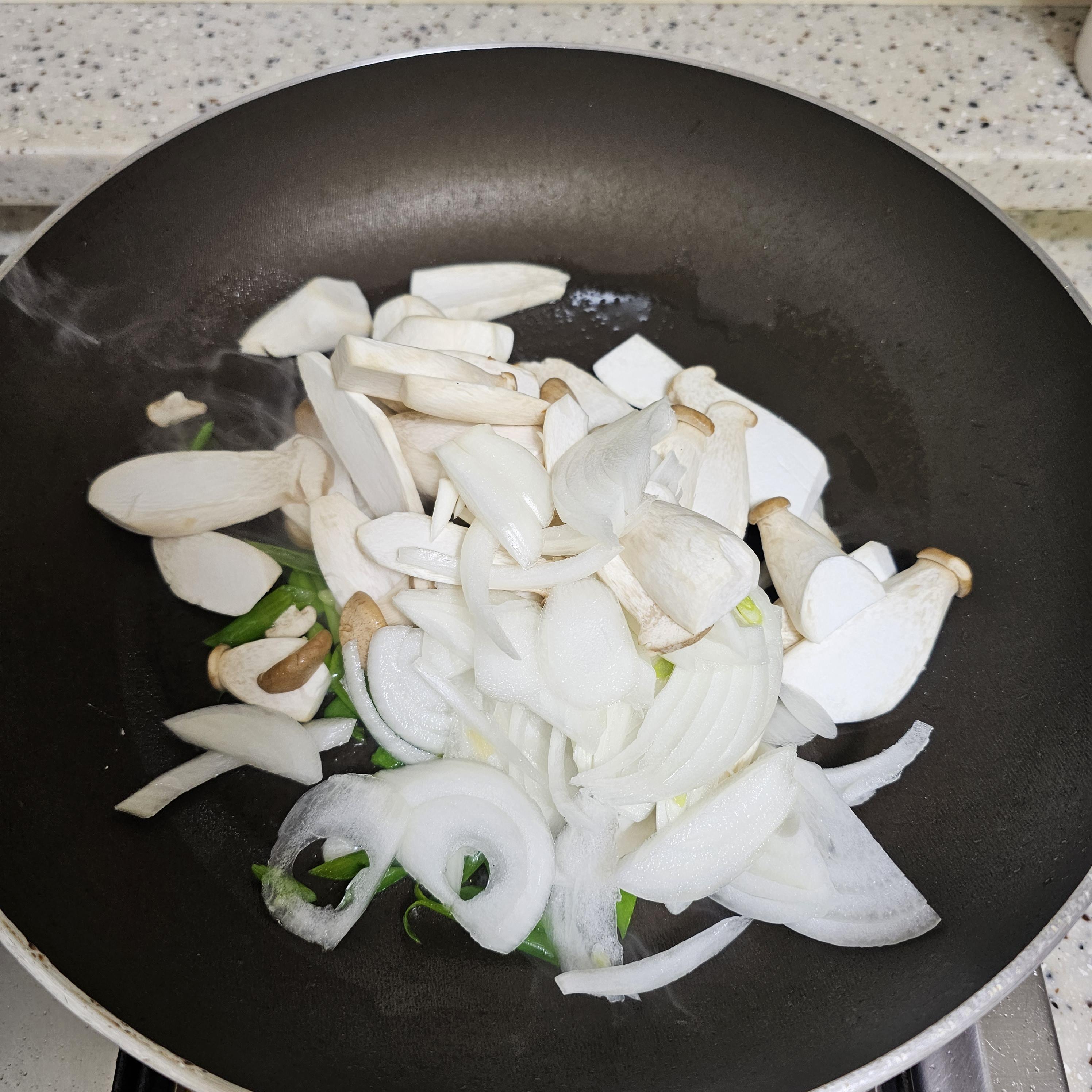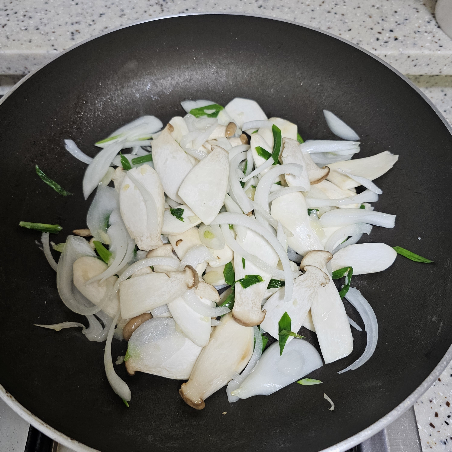 좀 기름이 나오면 새송이버섯과 양파를 넣어줍니다.