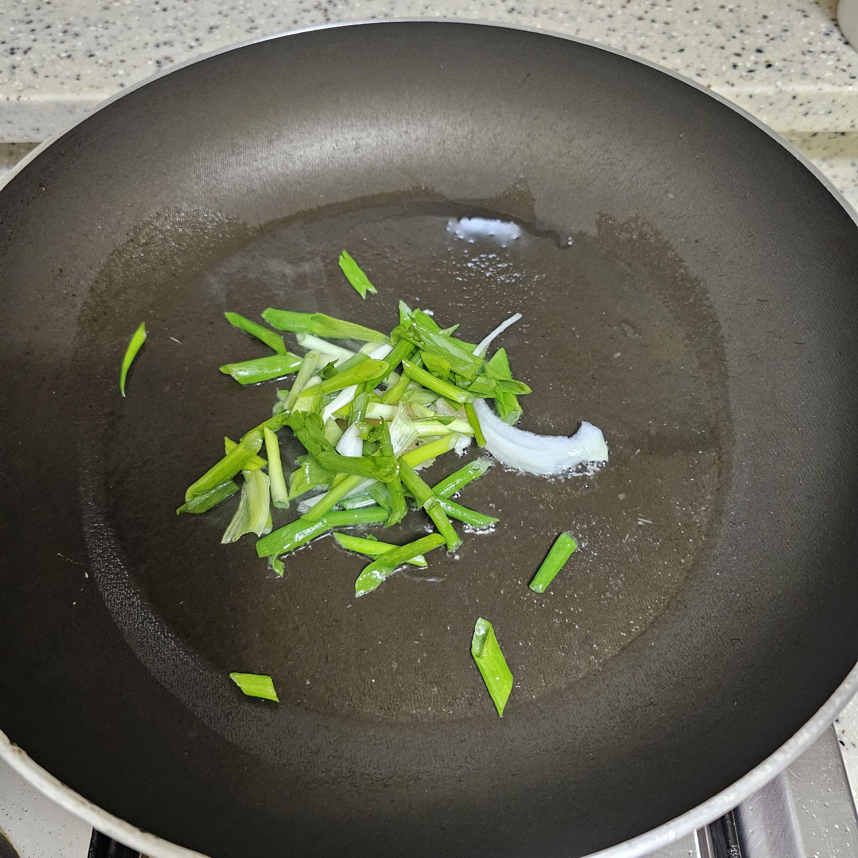 프라이팬에 다진 마늘 조금과 파를 넣어 기름을 내줍니다.