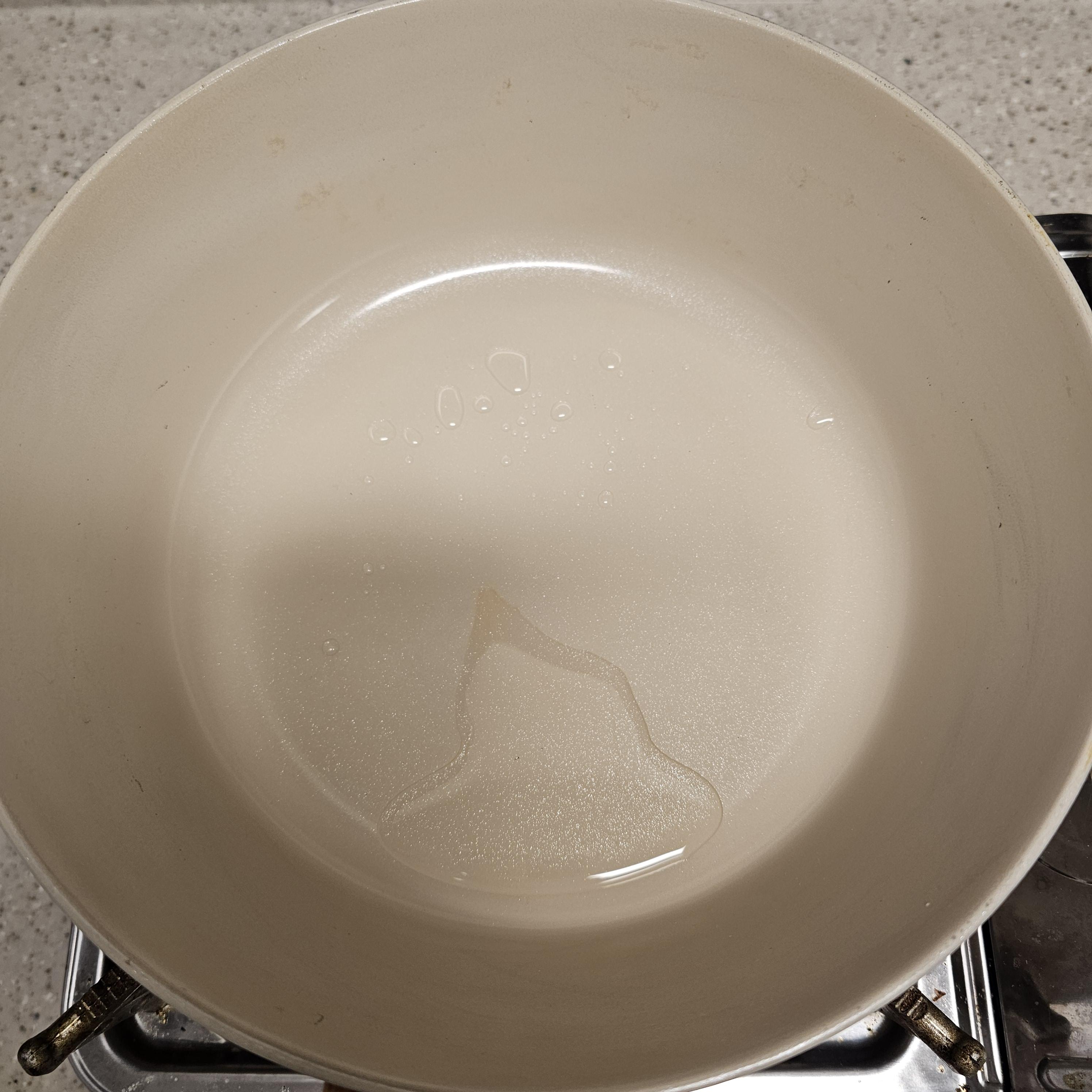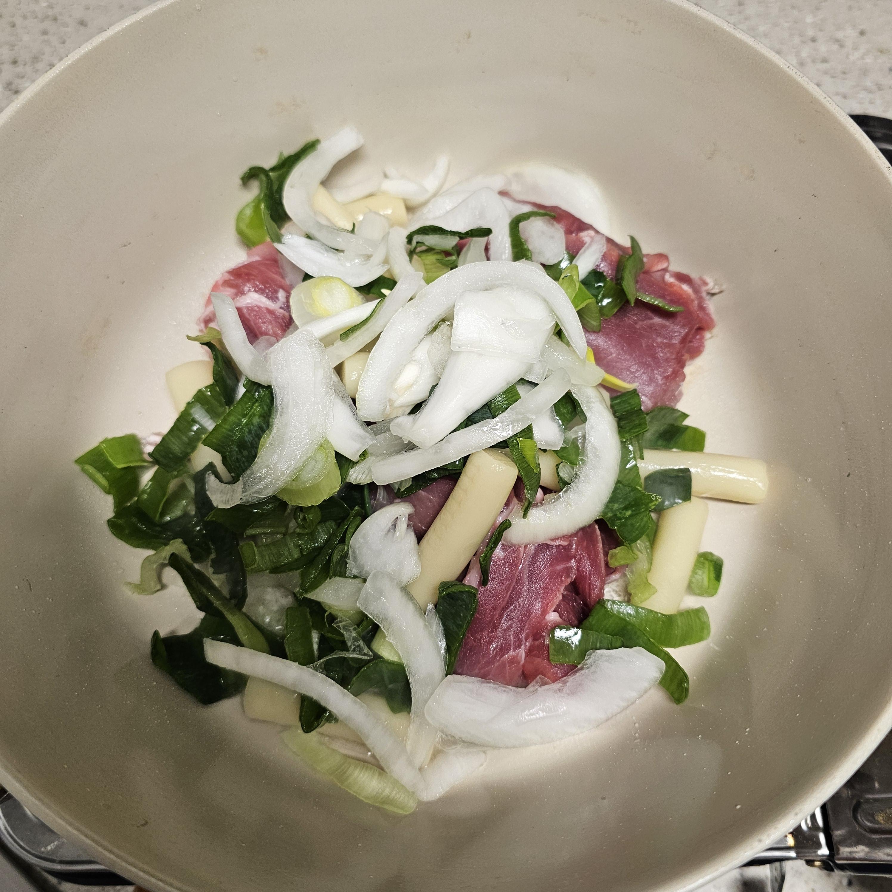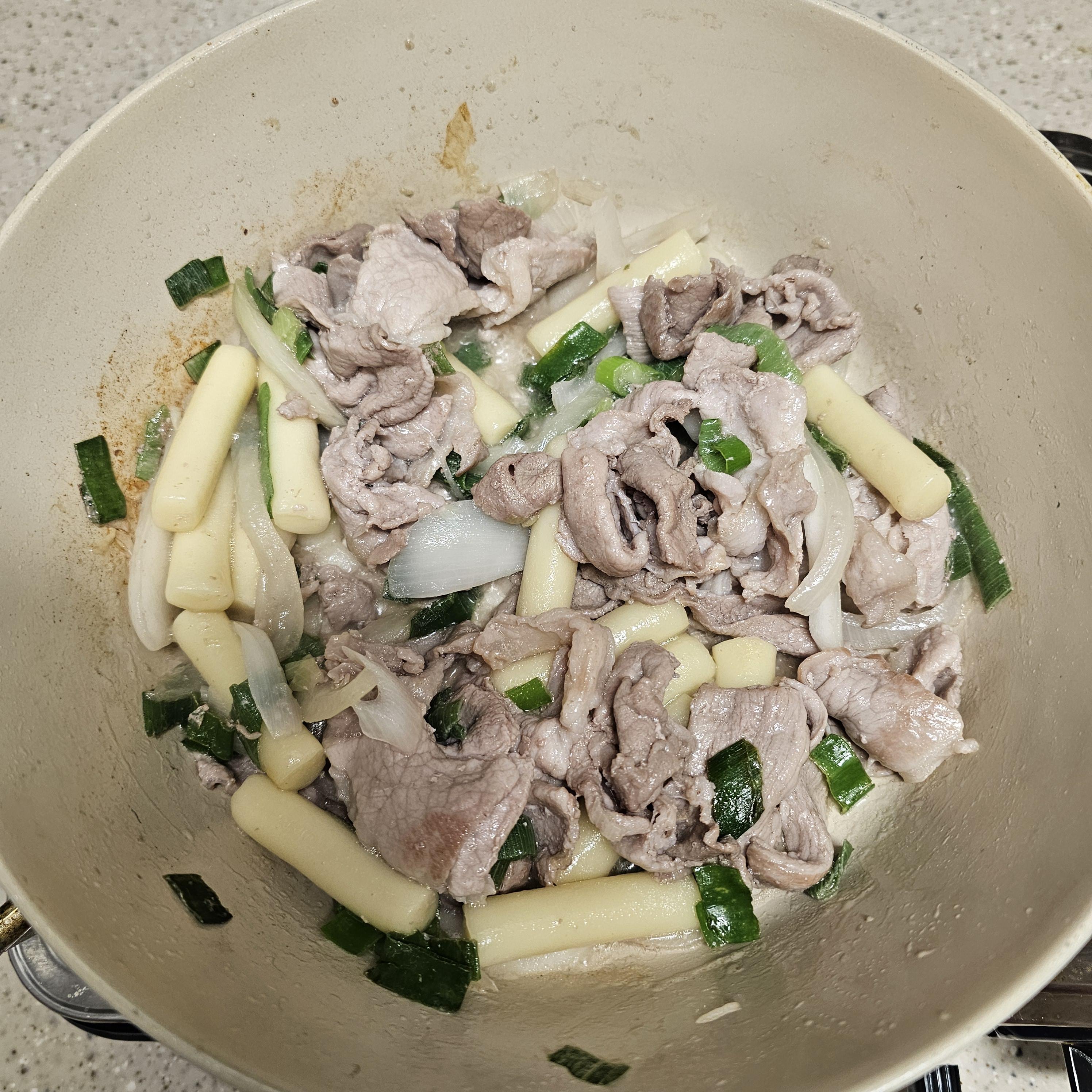 팬에 오일 1 큰술(15g)을 두르고 돼지고기, 양파, 대파, 떡을 넣어줍니다.