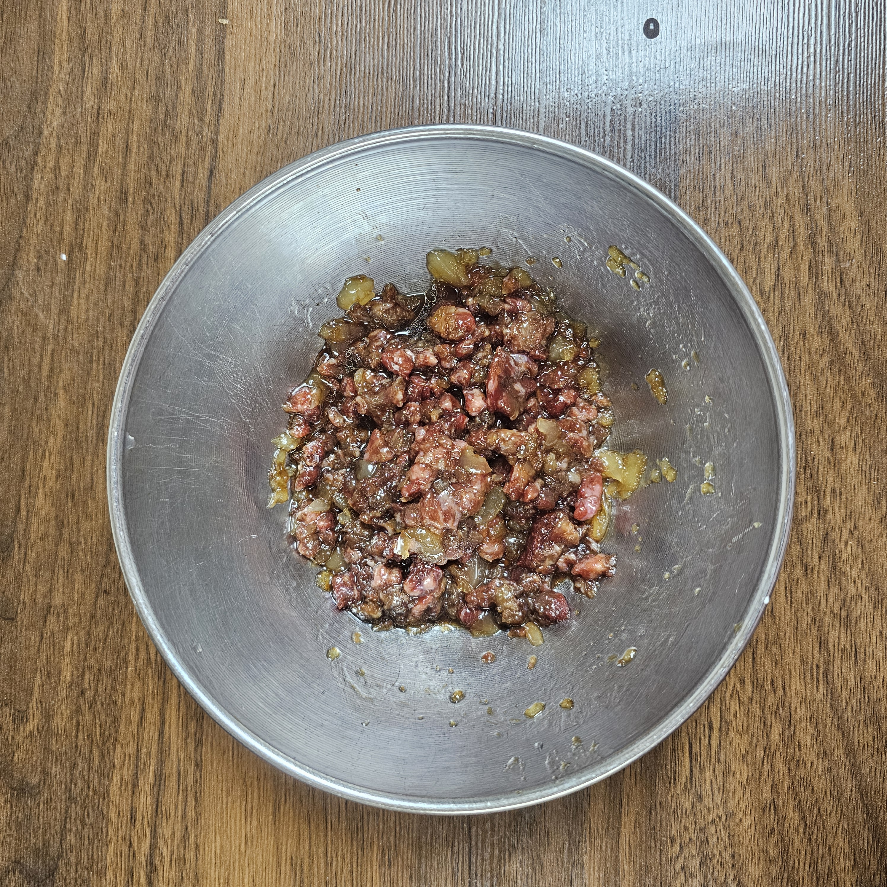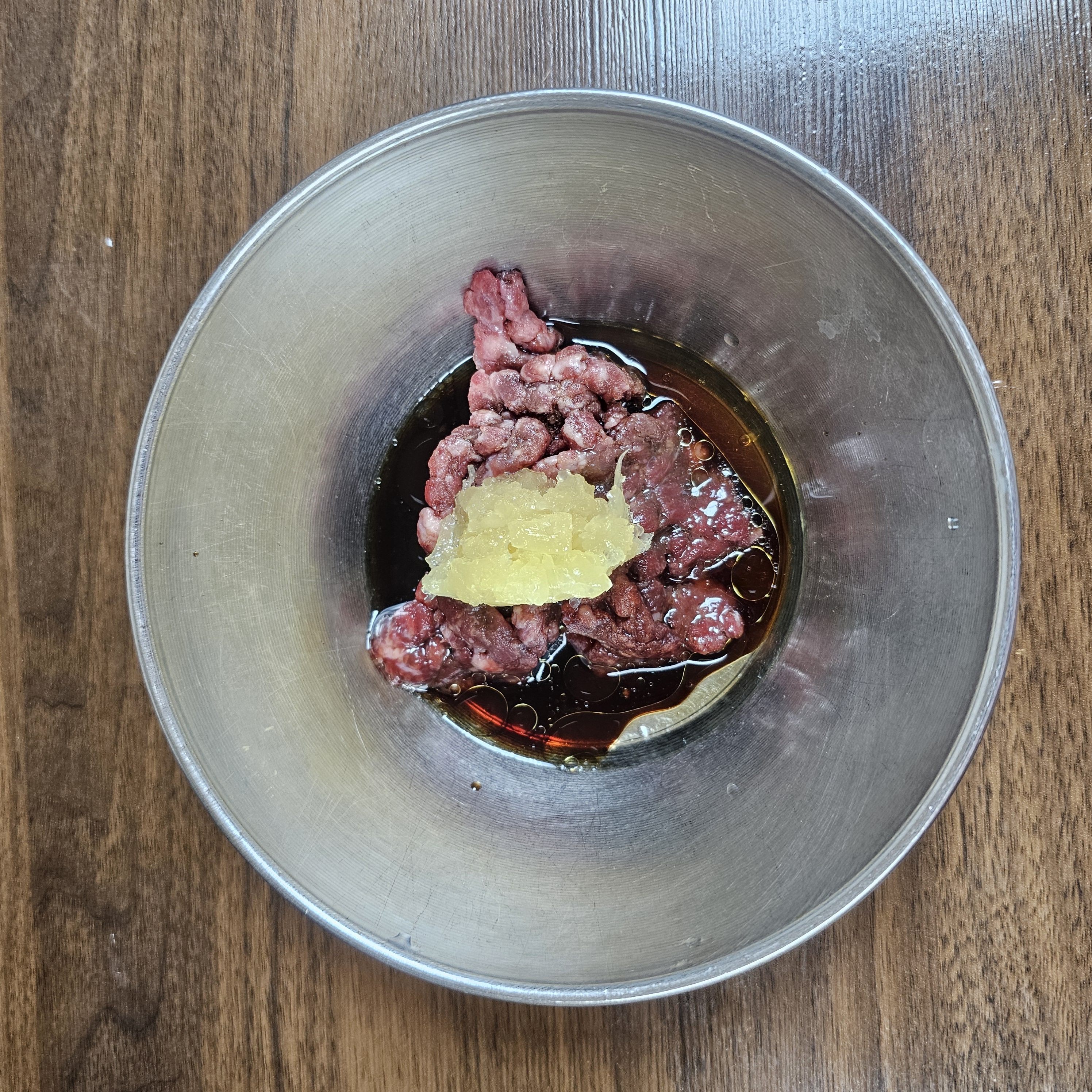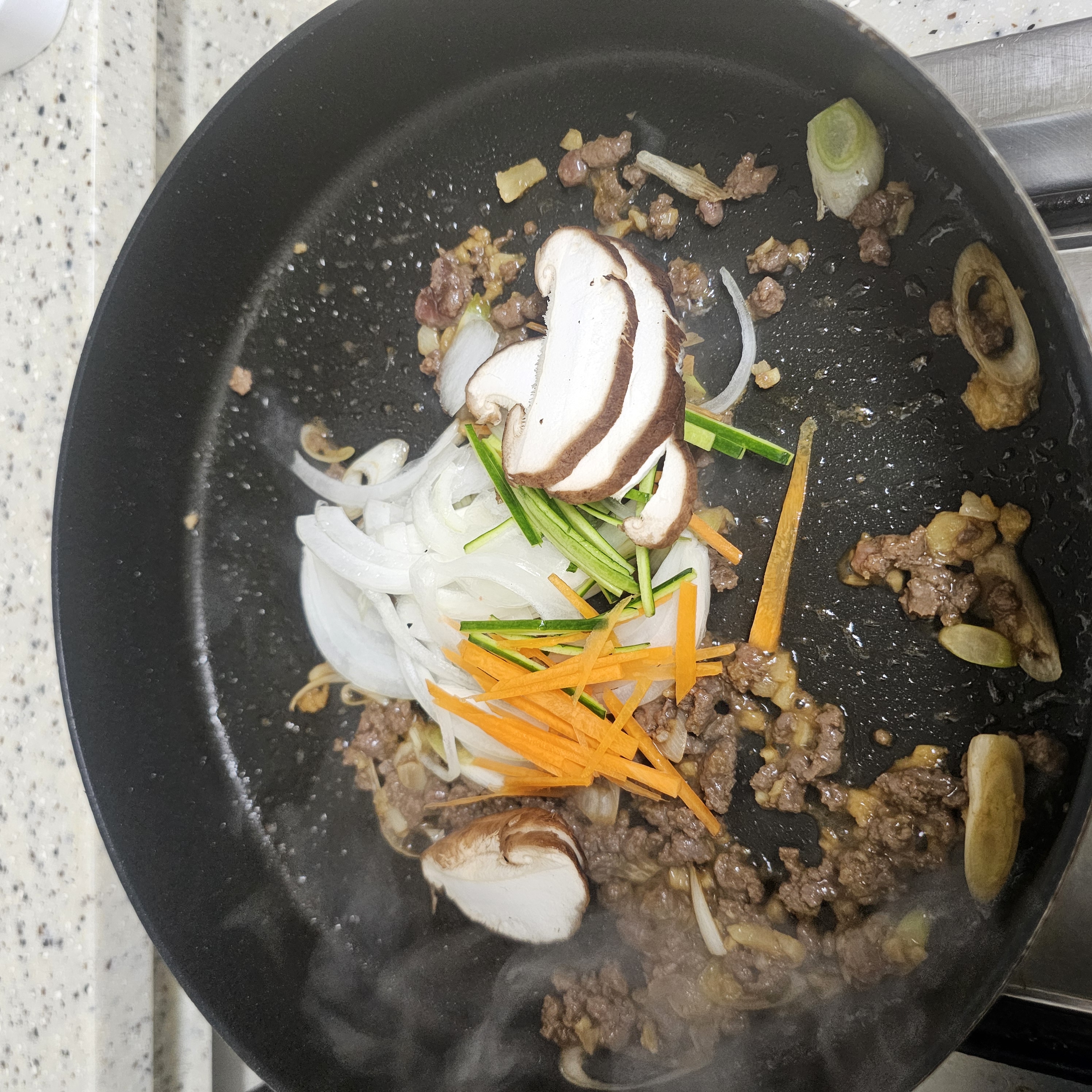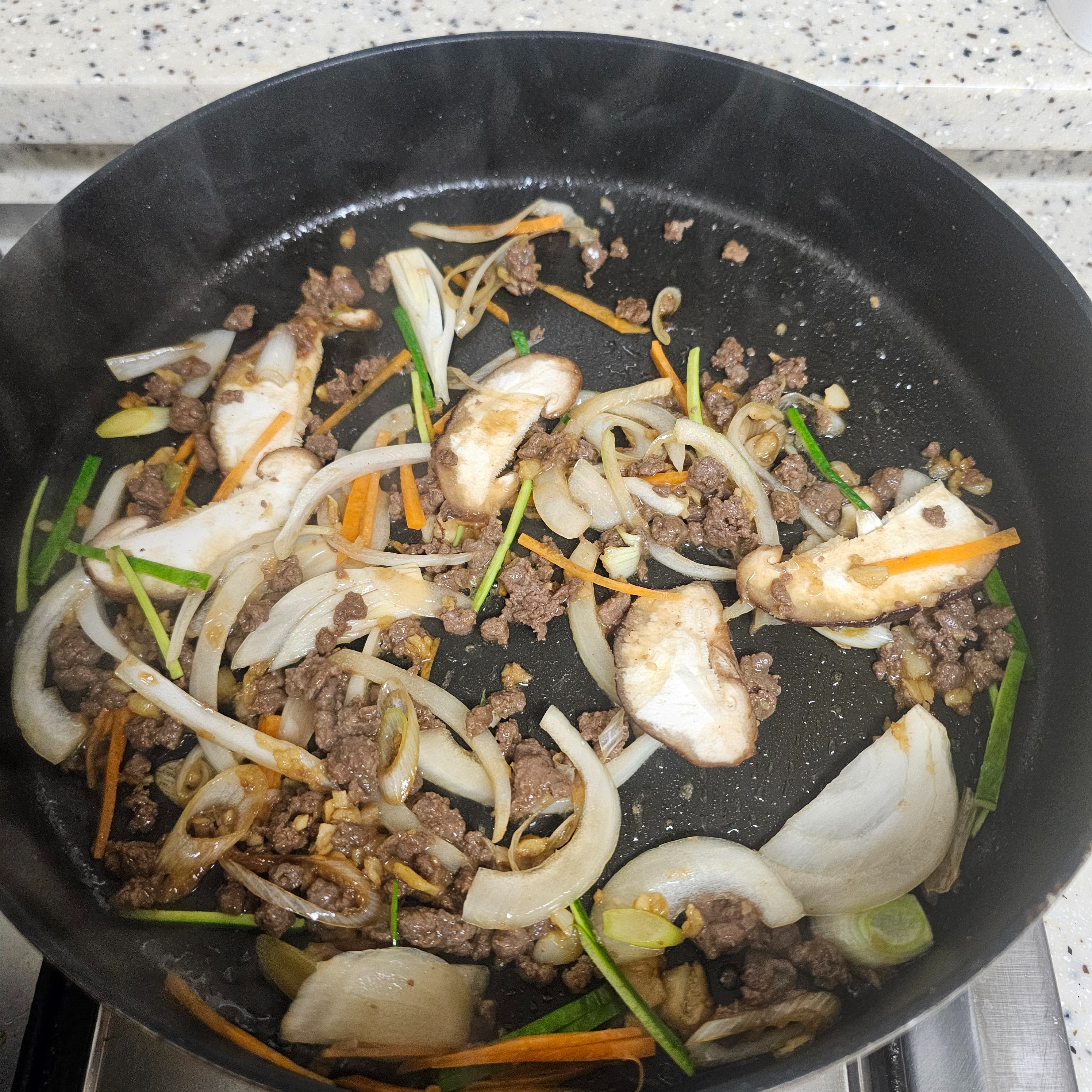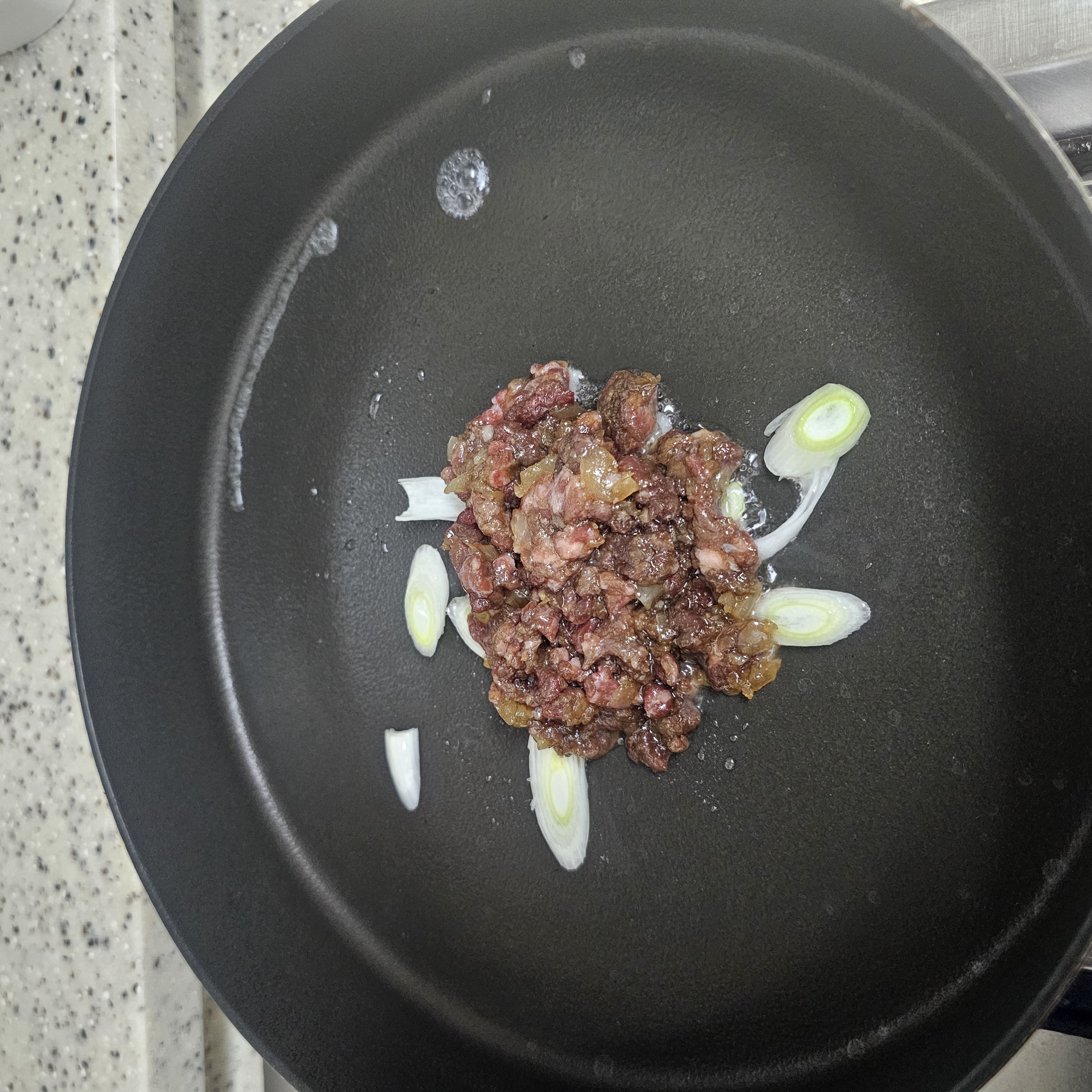 그리고 바로 미리 재워둔 다진 소고기를 넣어주세요.