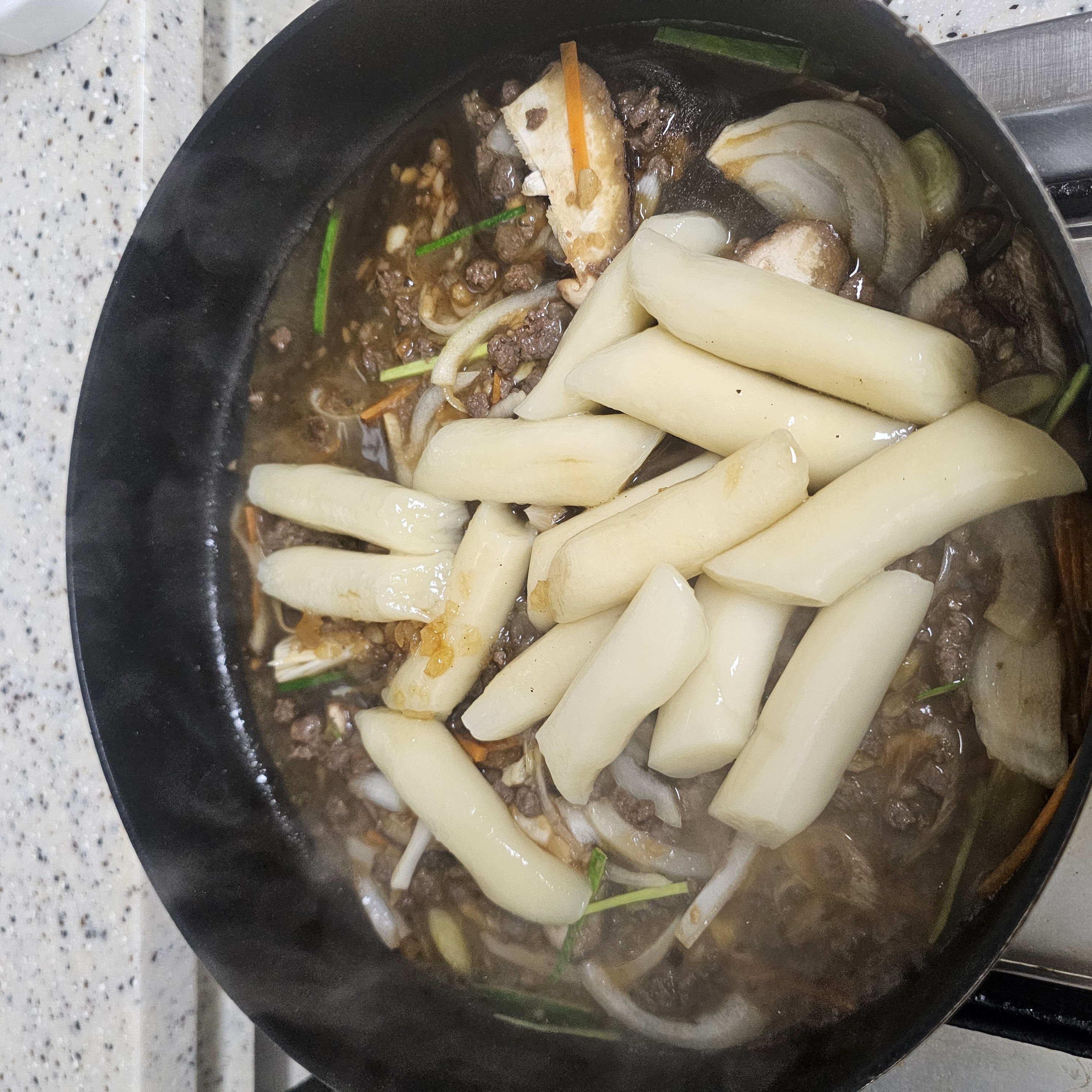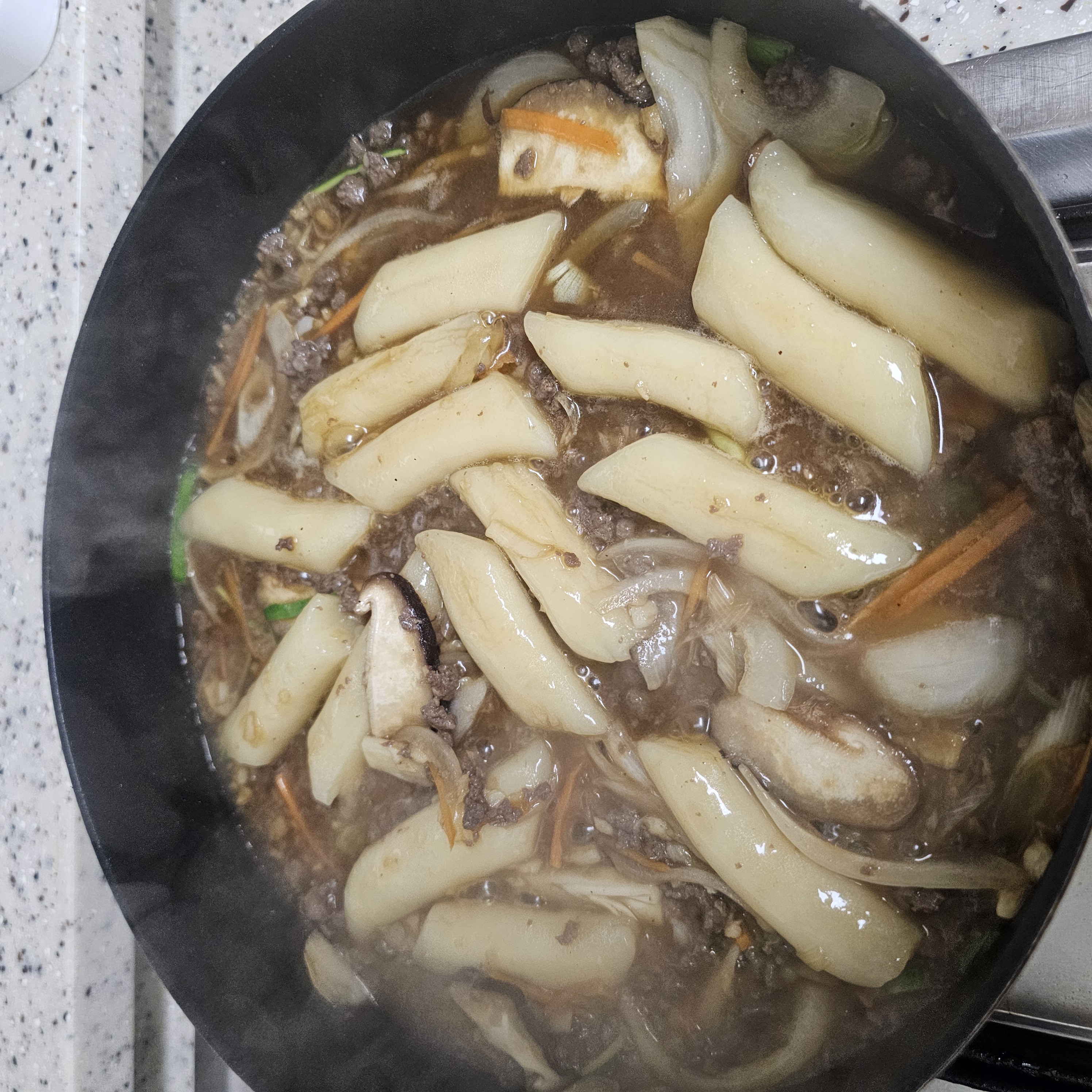 떡(쌀떡 or밀떡), 다진 소고기, 양파, 애호박, 당근, 파, 표고버섯